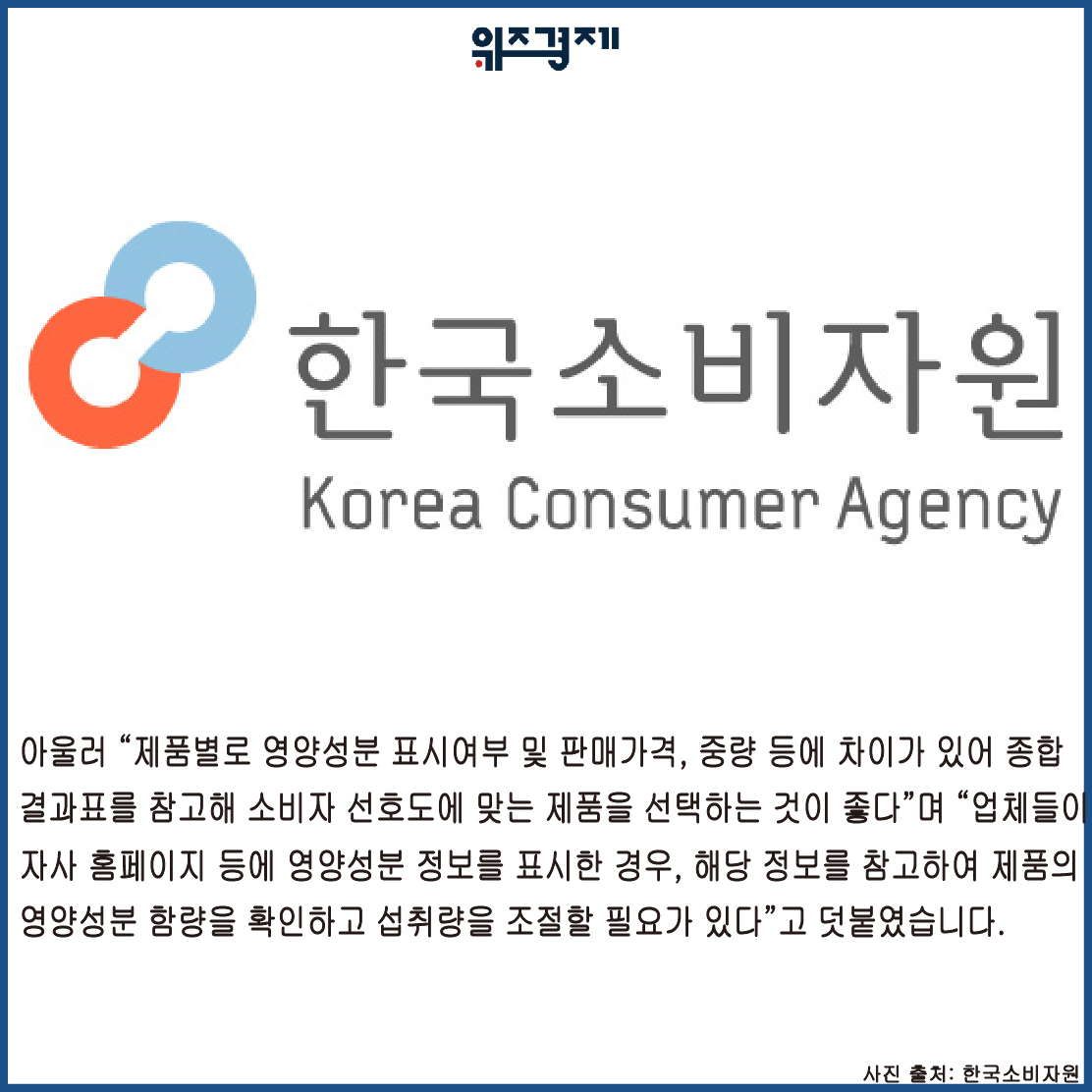 아울러 “제품별로 영양성분 표시여부 및 판매가격, 중량 등에 차이가 있어 종합결과표를 참고해 소비자 선호도에 맞는 제품을 선택하는 것이 좋다”며 “업체들이 자사 홈페이지 등에 영양성분 정보를 표시한 경우, 해당 정보를 참고하여 제품의 영양성분 함량을 확인하고 섭취량을 조절할 필요가 있다”고 덧붙였습니다.