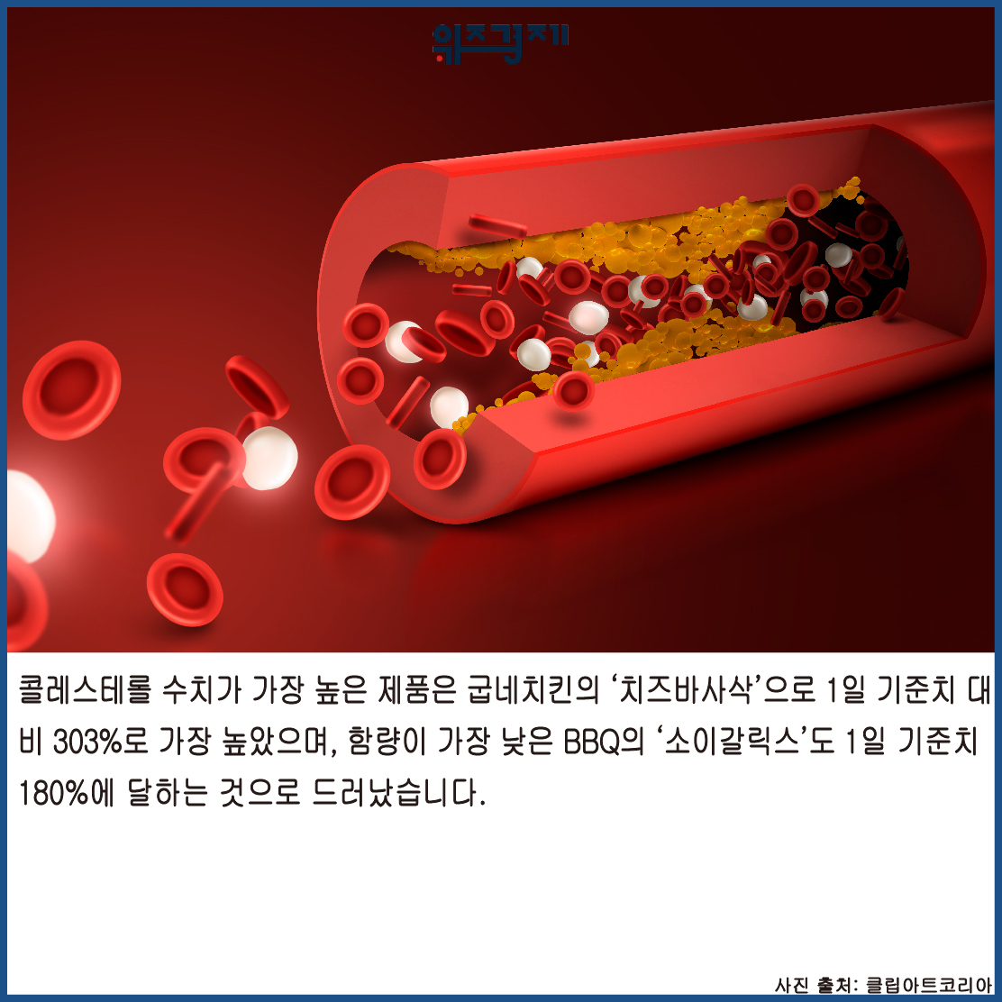 콜레스테롤 수치가 가장 높은 제품은 굽네치킨의 ‘치즈바사삭’으로 1일 기준치 대비 303%로
