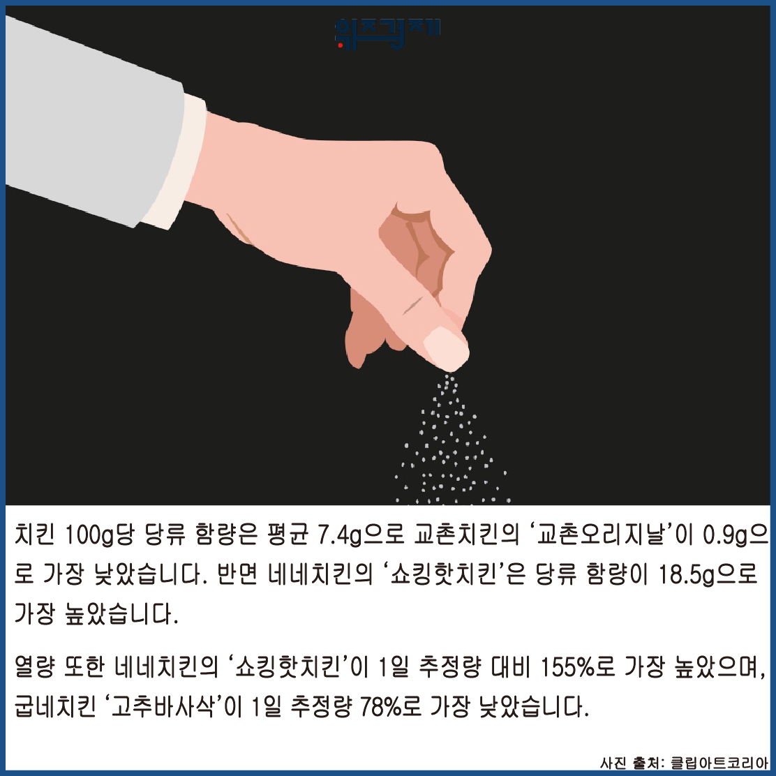교촌치킨의 ‘교촌오리지날’이 0.9g으로 가장 낮았습니다. 반면 네네치킨의 ‘쇼킹핫치킨’은 당류 함량이 18.5g으로