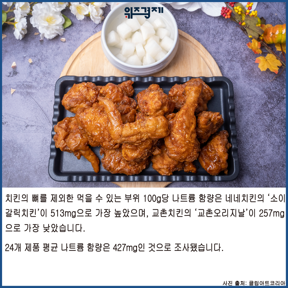 한국소비자원에 따르면 제품별로 중량 차이는 최대 2배 이상 났으며, 치킨 한 마리당 각종 영양성분 함량은 1일 섭취기준을 초과하는 것으로