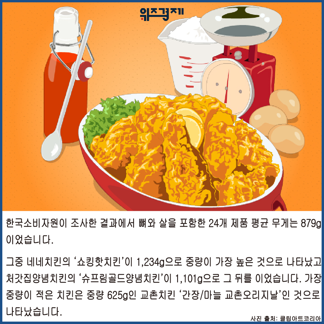 1,234g으로 중량이 가장 높은 것으로 나타났고 처갓집양념치킨의 ‘슈프림골드양념치킨’이 1,101g으로 그 뒤를 이었습니다. 가장 중량이 적은 치킨은 중량 625g인 교촌치킨 ‘간장/마늘 교촌오리지날’인