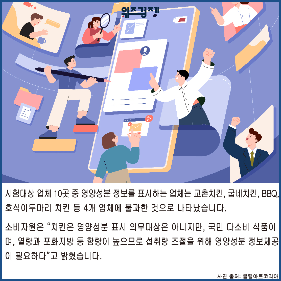 시험대상 업체 10곳 중 영양성분 정보를 표시하는 업체는 교촌치킨, 굽네치킨, BBQ, 호식이두마리 치킨 등 4개 업체에 불과한 것으로 나타났습니다.
