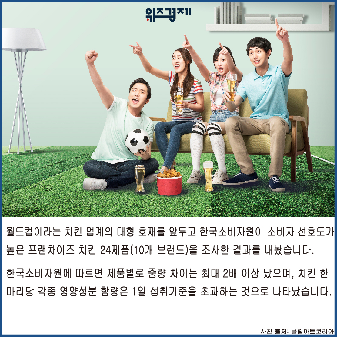 [위즈경제] 이정원 기자 = 월드컵이라는 치킨 업계의 대형 호재를 앞두고 한국소비자원이 소비자 선호도가 높은 프랜차이즈 치킨 24제품(10개 브랜드)을 조사한 결과를 내놨습니다.