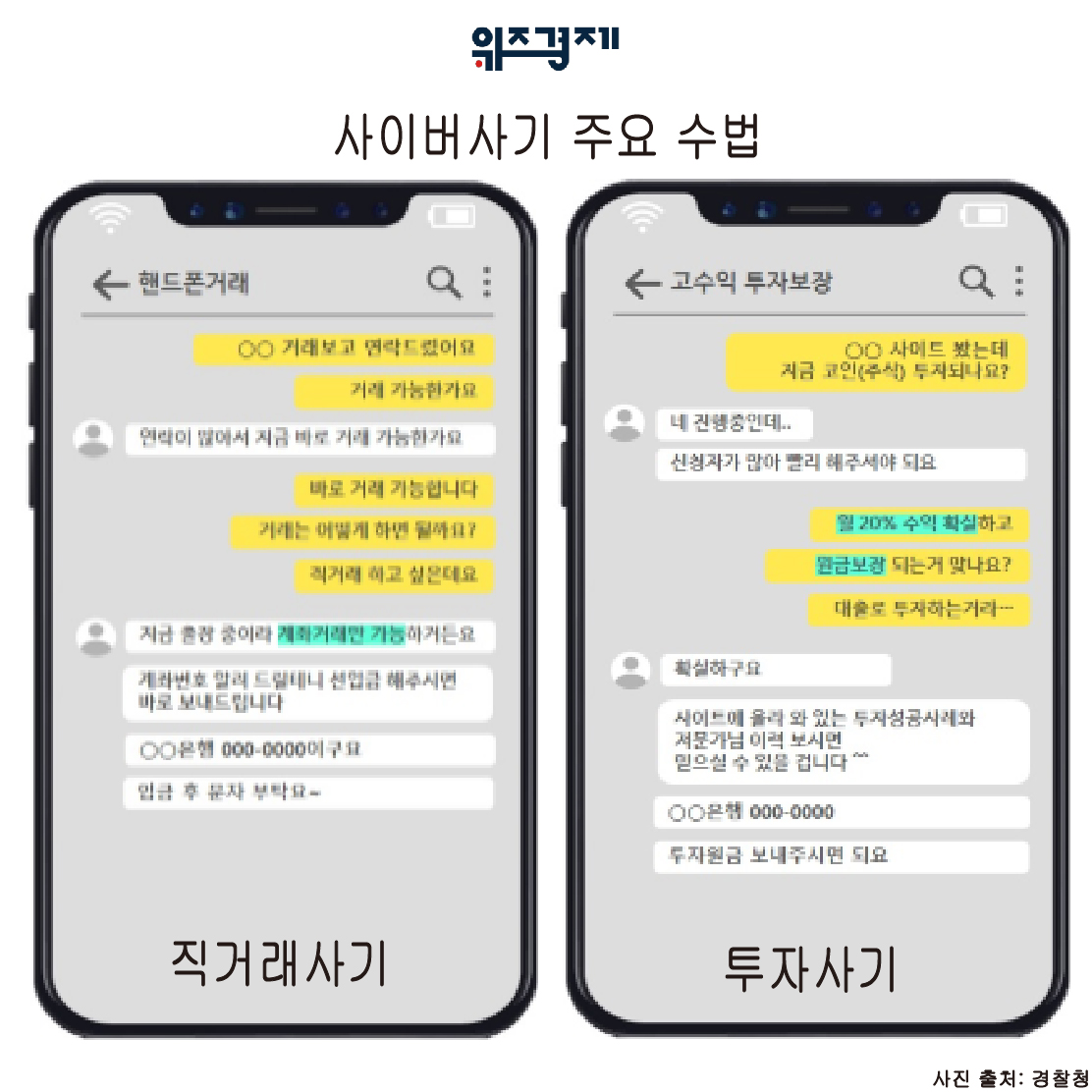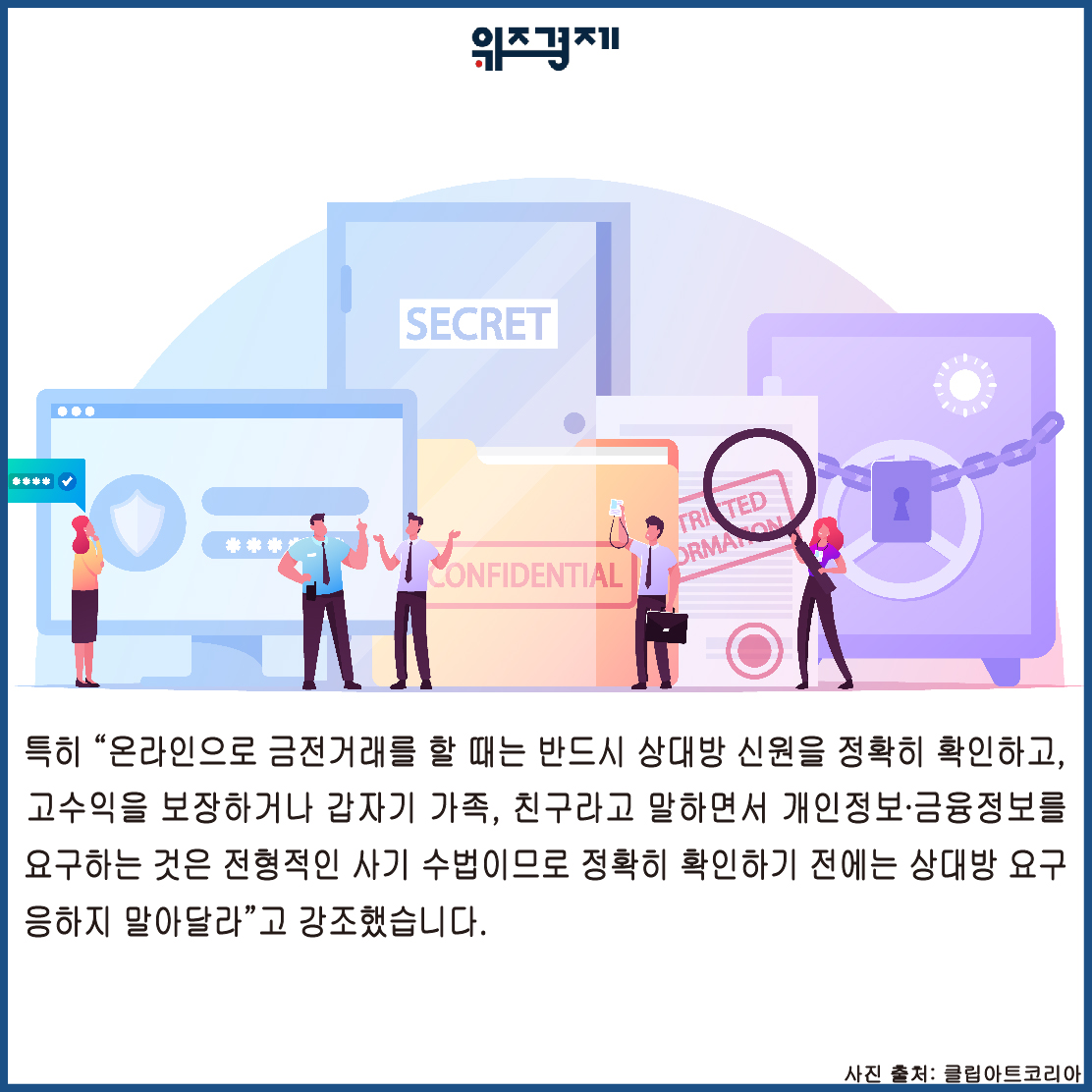 특히 “온라인으로 금전거래를 할 때는 반드시 상대방 신원을 정확히 확인하고, 고수익을 보장하거나 갑자기 가족, 친구라고 말하면서 개인정보∙금융정보를 요구하는 것은 전형적인 사기 수법이므로 정확히 확인하기 전에는 상대방 요구에 응하지 말아달라”고 강조했습니다.