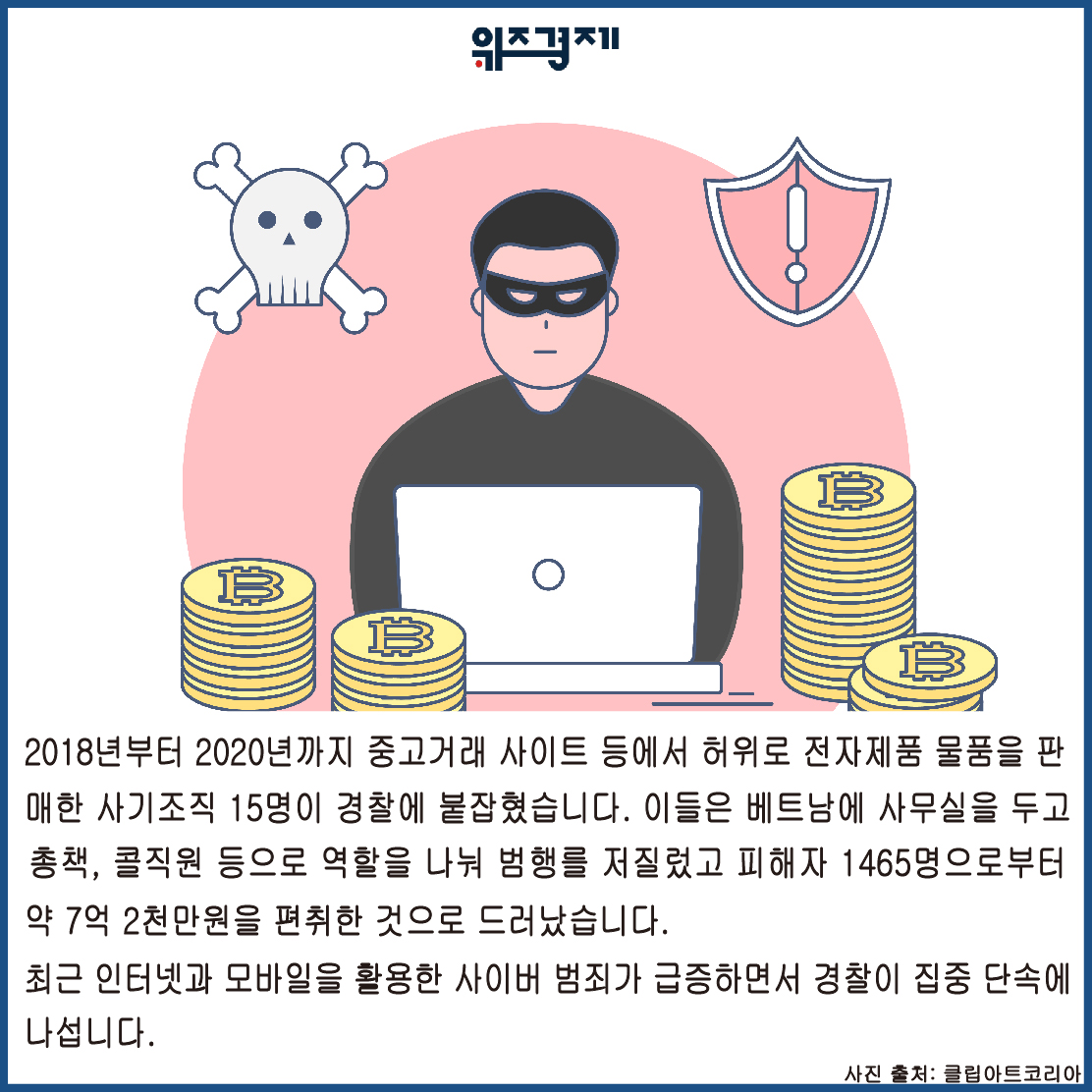 [위즈경제] 이정원 기자 = 2018년부터 2020년까지 중고거래 사이트 등에서 허위로 전자제품 물품을 판매한 사기조직 15명이 경찰에 붙잡혔습니다. 이들은 베트남에 사무실을 두고 총책, 콜직원 등으로 역할을 나눠 범행를 저질렀고 피해자 1465명으로부터 약 7억 2천만원을 편취한 것으로 드러났습니다. 최근 인터넷과 모바일을 활용한 사이버 범죄가 급증하면서 경찰이 집중 단속에 나섭니다.