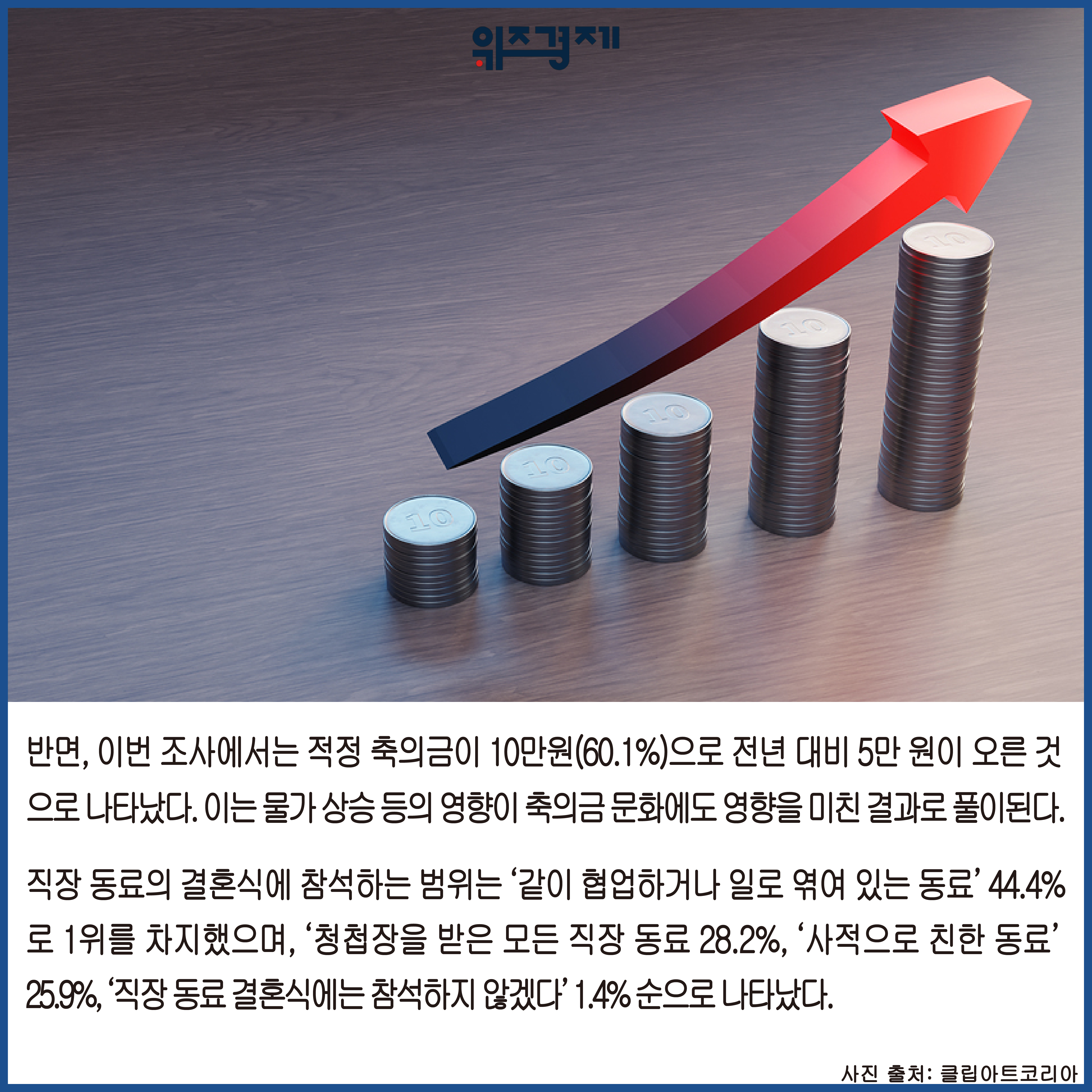 반면, 이번 조사에서는 적정 축의금이 10만원(60.1%)으로 전년 대비 5만 원이 오른 것으로 나타났다. 이는 물가 상승 등의 영향이 축의금