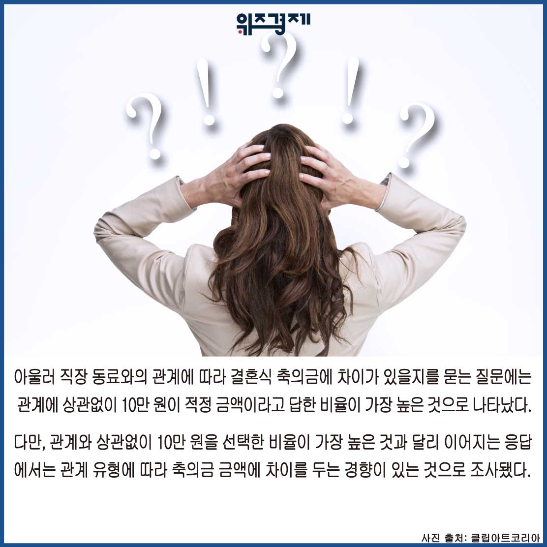 아울러 직장 동료와의 관계에 따라 결혼식 축의금에 차이가 있을지를 묻는 질문에는 관계에 상관없이 10만 원이 적정 금액이라고 답한 비율이 가장 높은 것으로 나타났다.