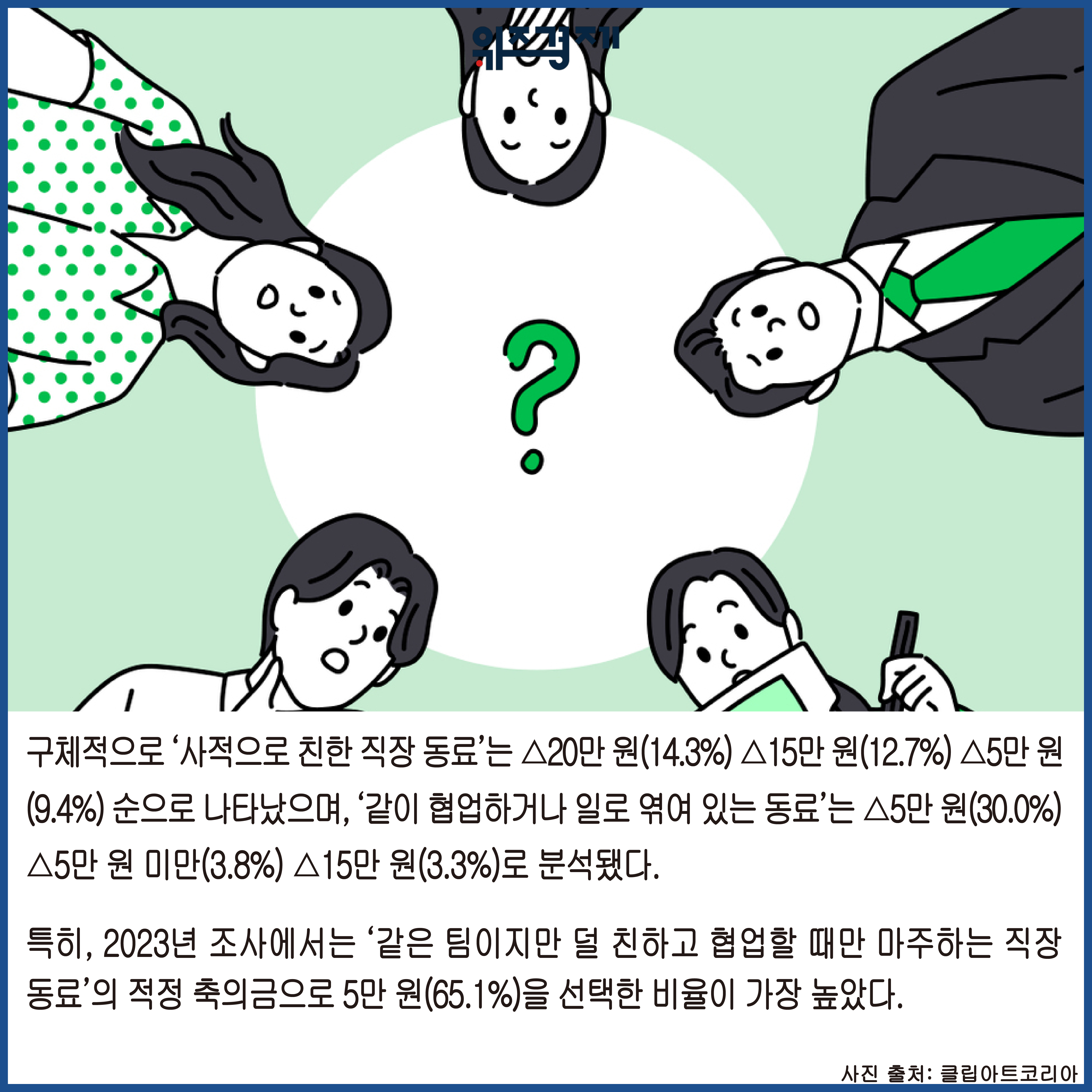 팀이지만 덜 친하고 협업할 때만 마주하는 직장 동료’의 적정 축의금으로 5만 원(65.1%)을 선택한 비율이 가장 높았다.