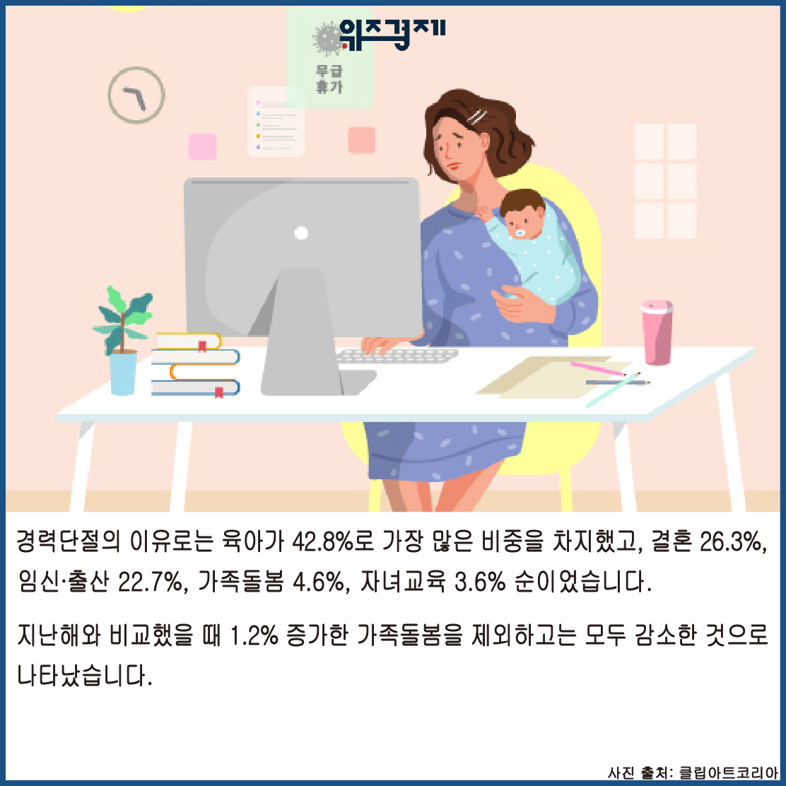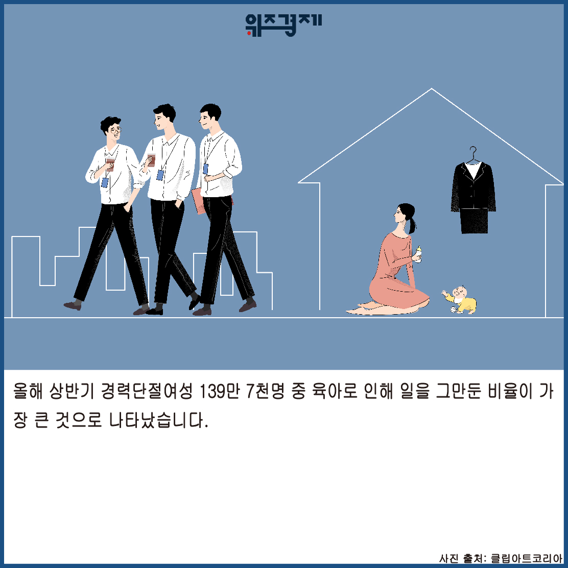 [위즈경제] 이정원 기자 = 올해 상반기 경력단절여성 139만 7천명 중 육아로 인해 일을 그만둔 비율이 가장 큰 것으로 나타났습니다.