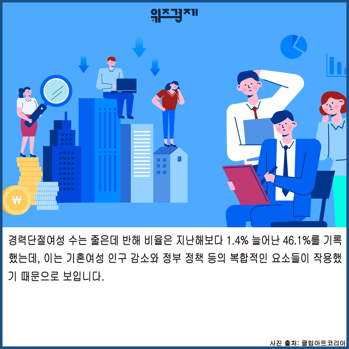 경력단절여성 수는 줄은데 반해 비율은 지난해보다 1.4% 늘어난 46.1%를 기록했는데, 이는 기혼여성 인구 감소와 정부 정책 등 복합적인 요소들이 작용했기 때문으로 보입니다.