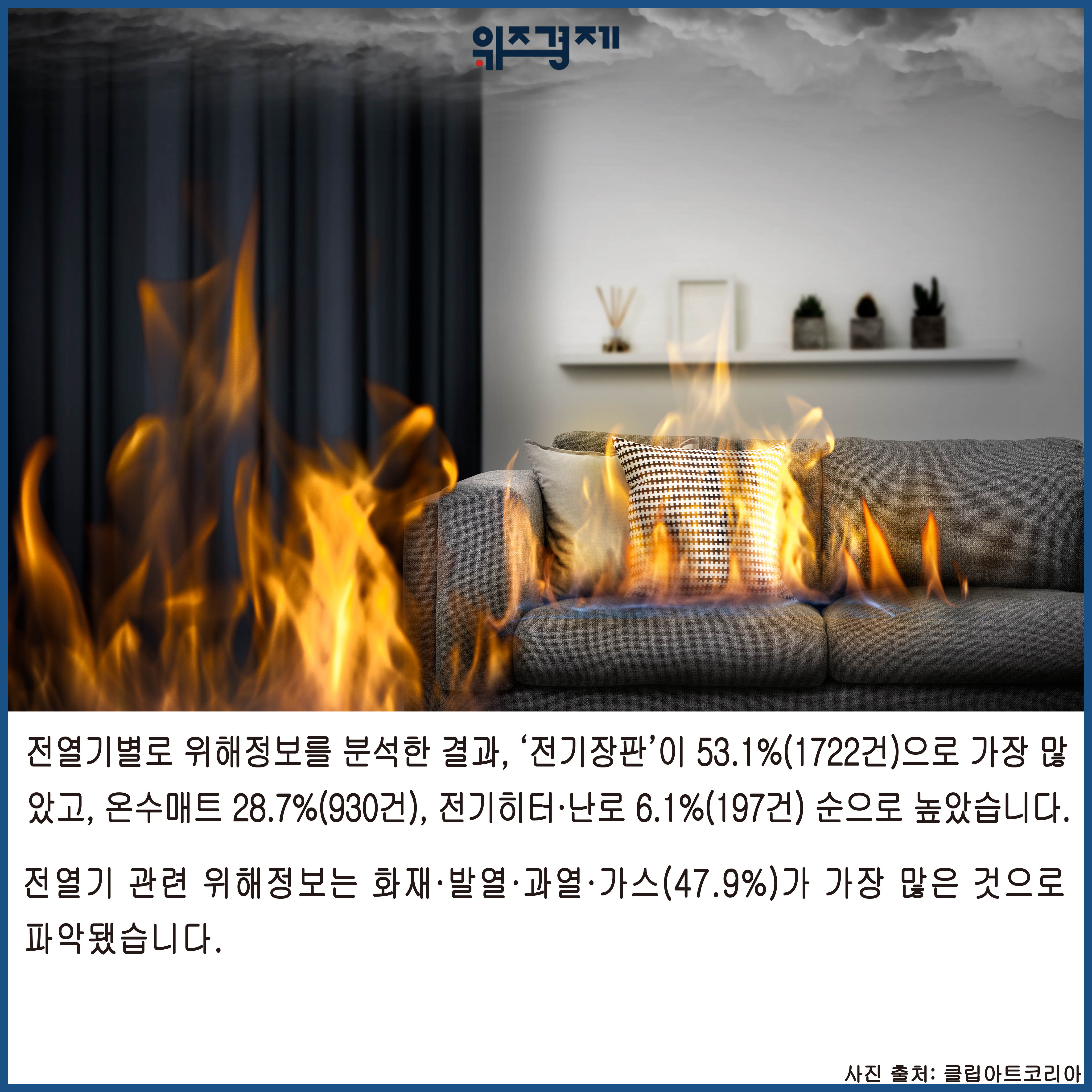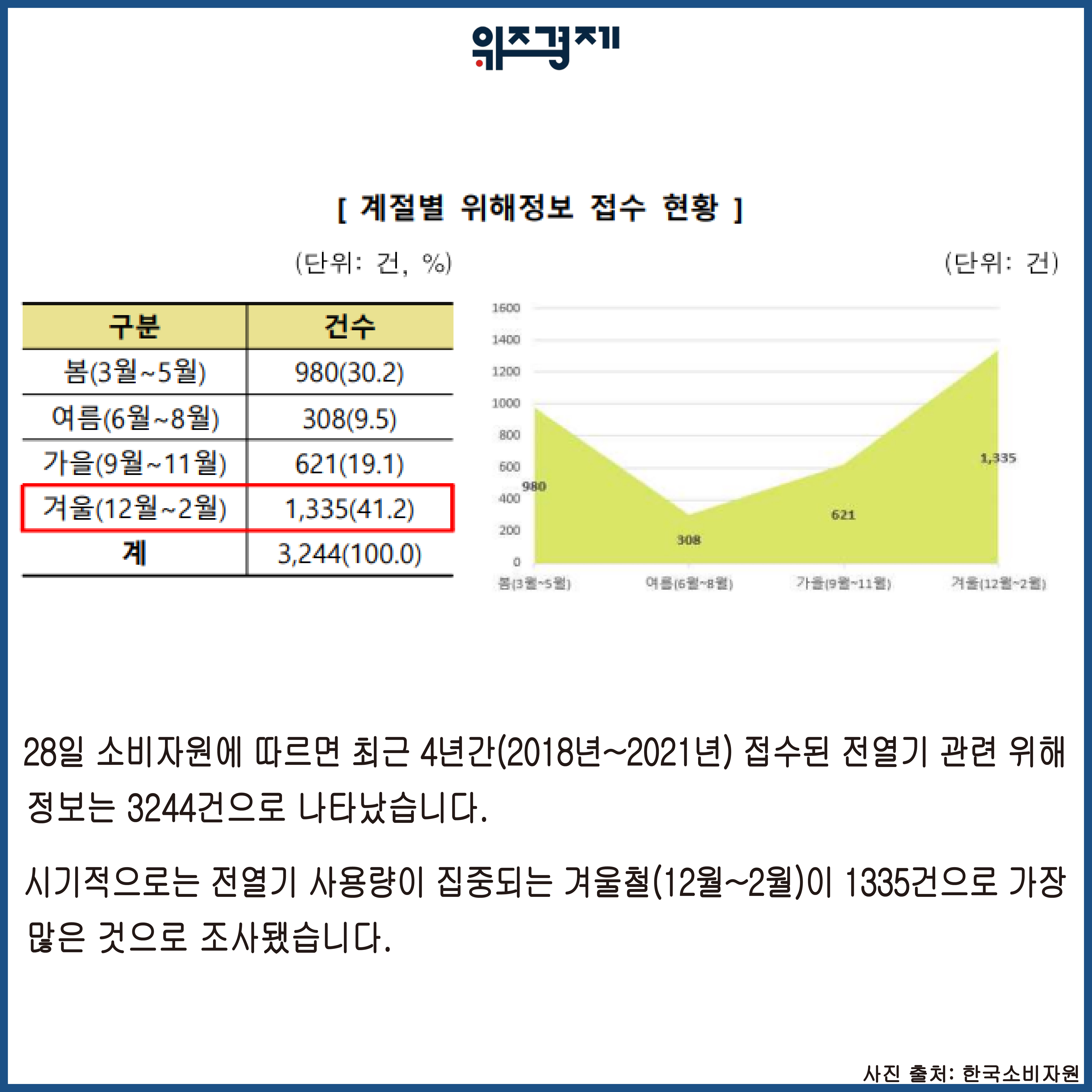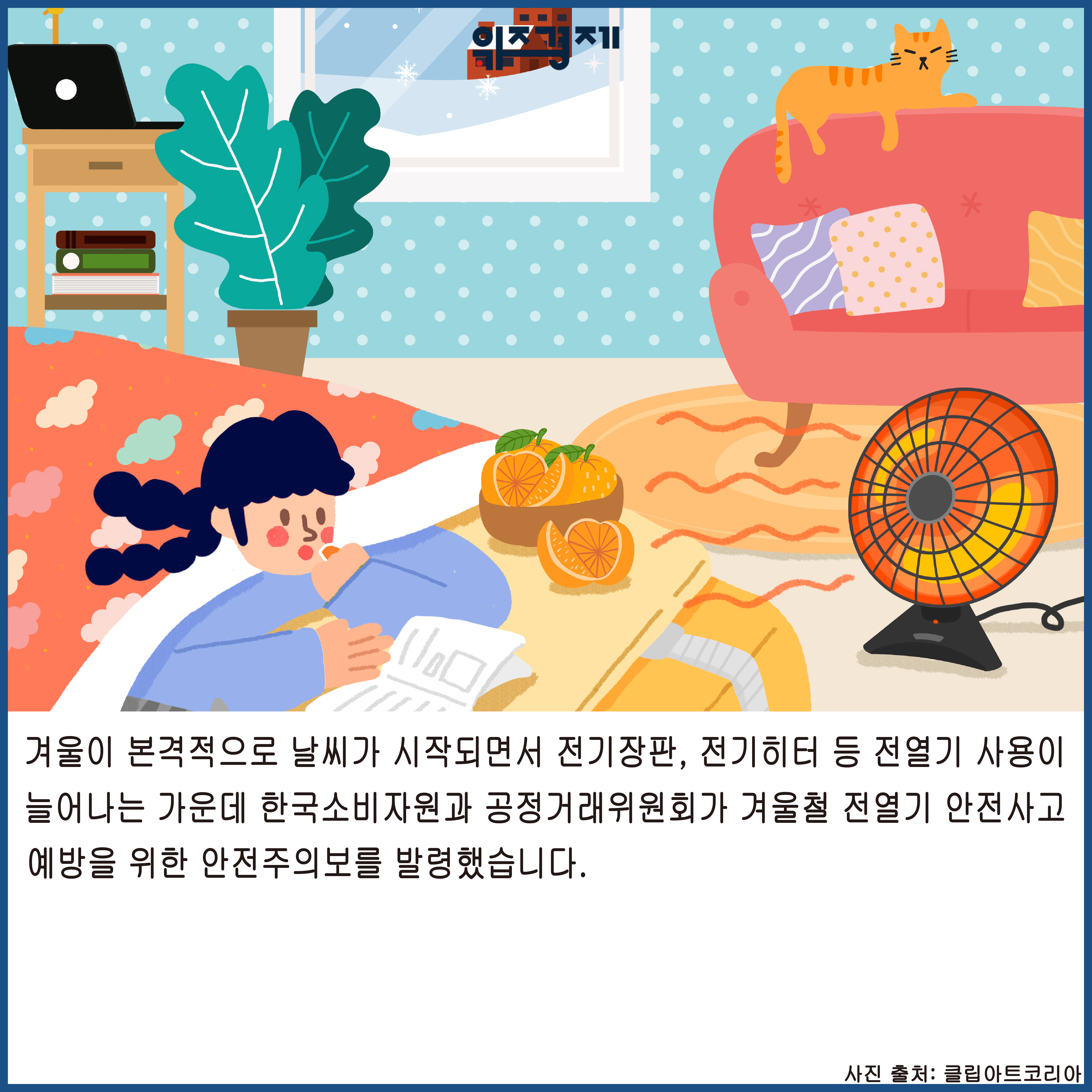 [위즈경제] 이정원 기자 = 겨울이 본격적으로 시작되면서 전기장판, 전기히터 등 전열기 사용이 늘어나는 가운데 한국소비자원과 공정거래위원회가 겨울철 전열기 안전사고 예방을 위한 안전주의보를 발령했습니다.