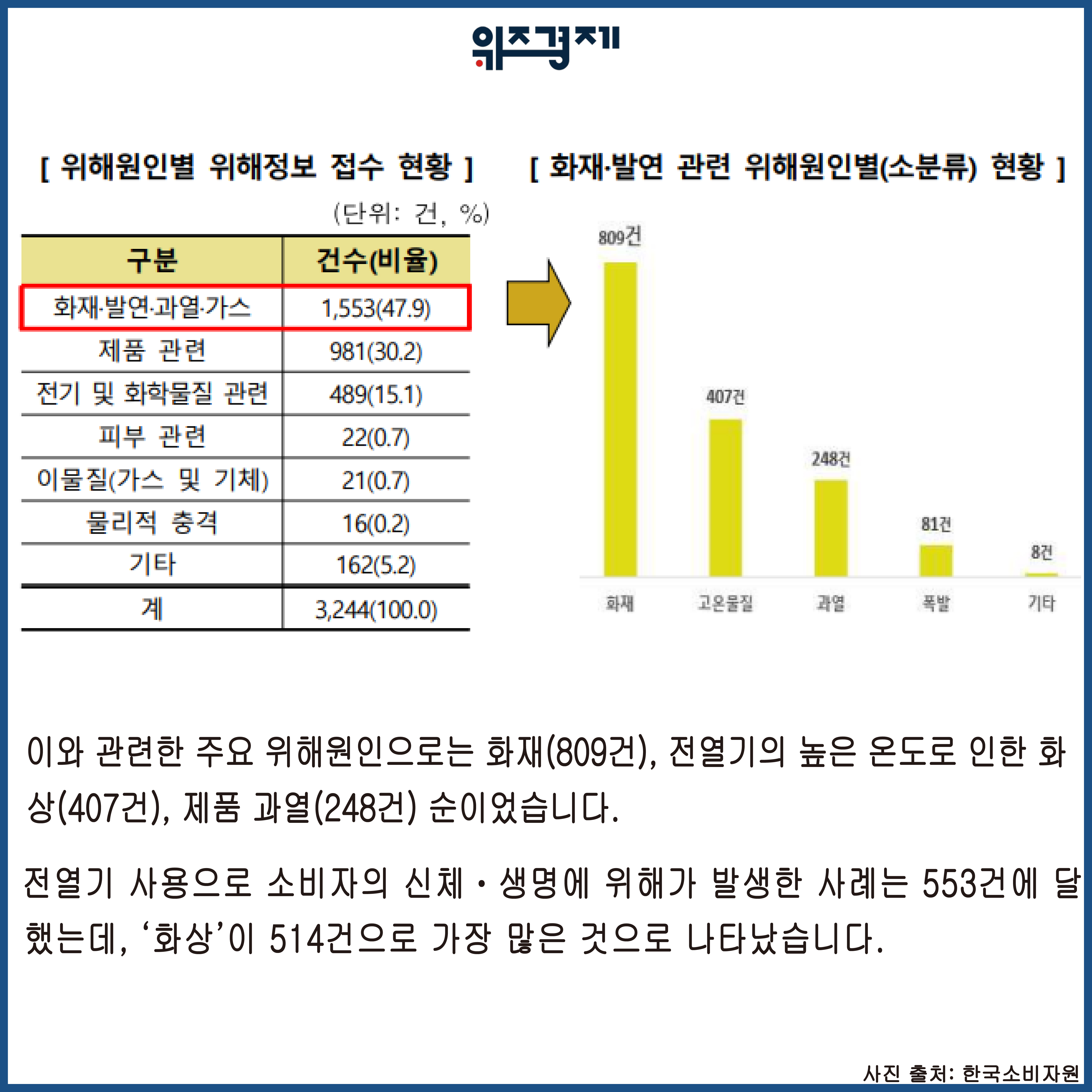 전열기 사용으로 인해 소비자의 신체·생명에 위해가 발생한 사례는 553건에 달했는데, ‘화상’이 514건으로