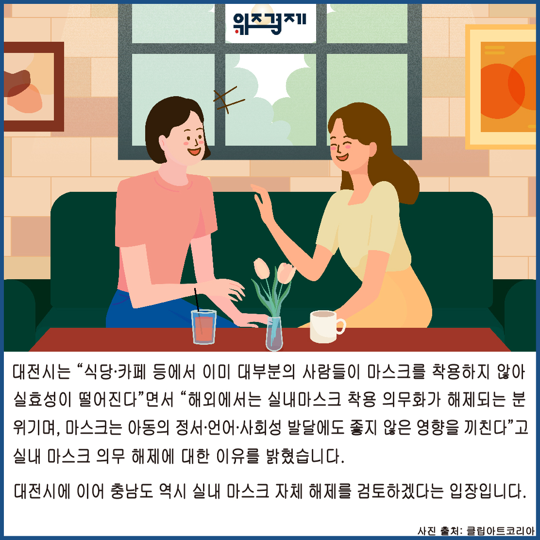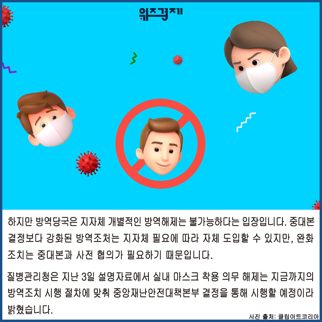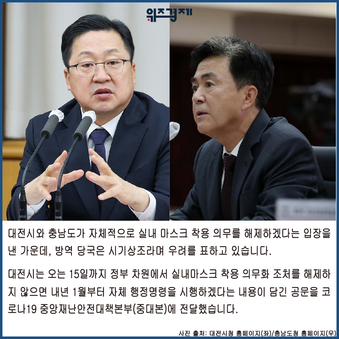 [위즈경제] 이정원 기자 = 대전시와 충남도가 자체적으로 실내 마스크 착용 의무를 해제하겠다는 입장을 낸 가운데, 방역 당국은 시기상조라며 우려를 표하고 있습니다.