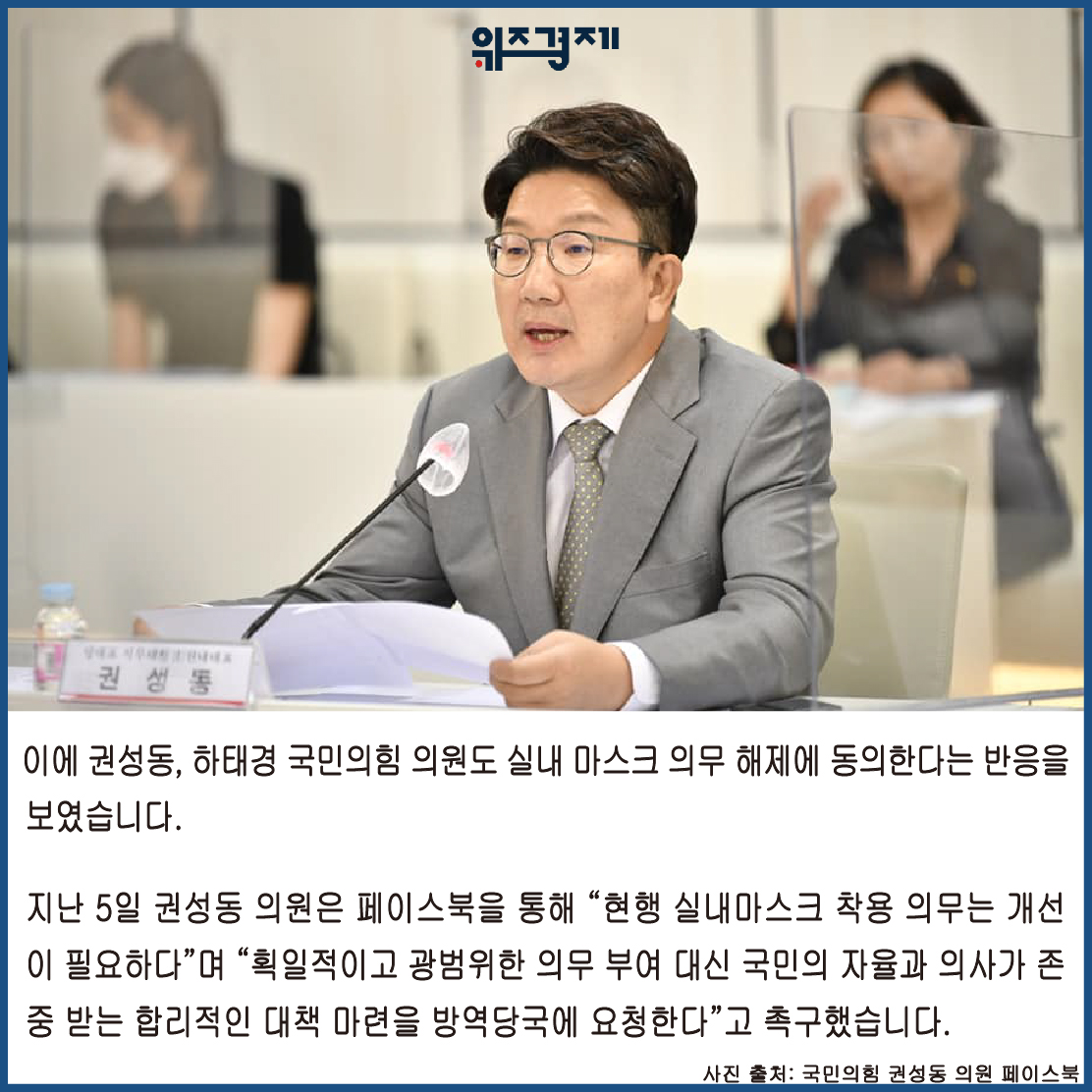 지난 5일 권성동 의원은 페이스북을 통해 “현행 실내마스크 착용 의무는 개선이 필요하다”며 “획일적이고 광범위한 의무 부여 대신 국민의 자율과 의사가 존중 받는 합리적인 대책 마련을 방역당국에 요청한다”고 촉구했습니다.