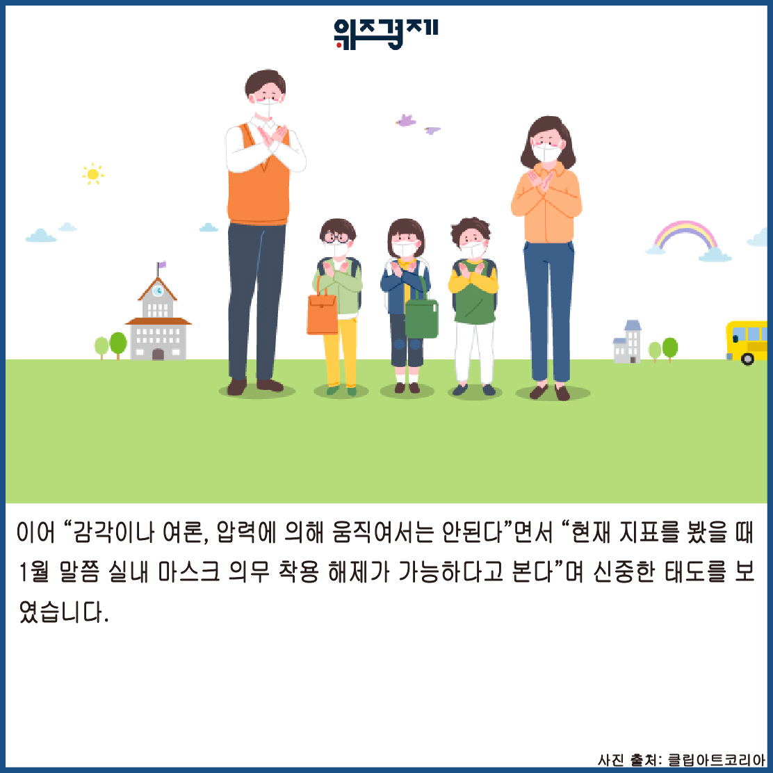 의해 움직여서는 안된다”면서 “현재 지표를 봤을 때 1월 말쯤 실내 마스크 의무 착용 해제가 가능하다고 본다”며 신중한