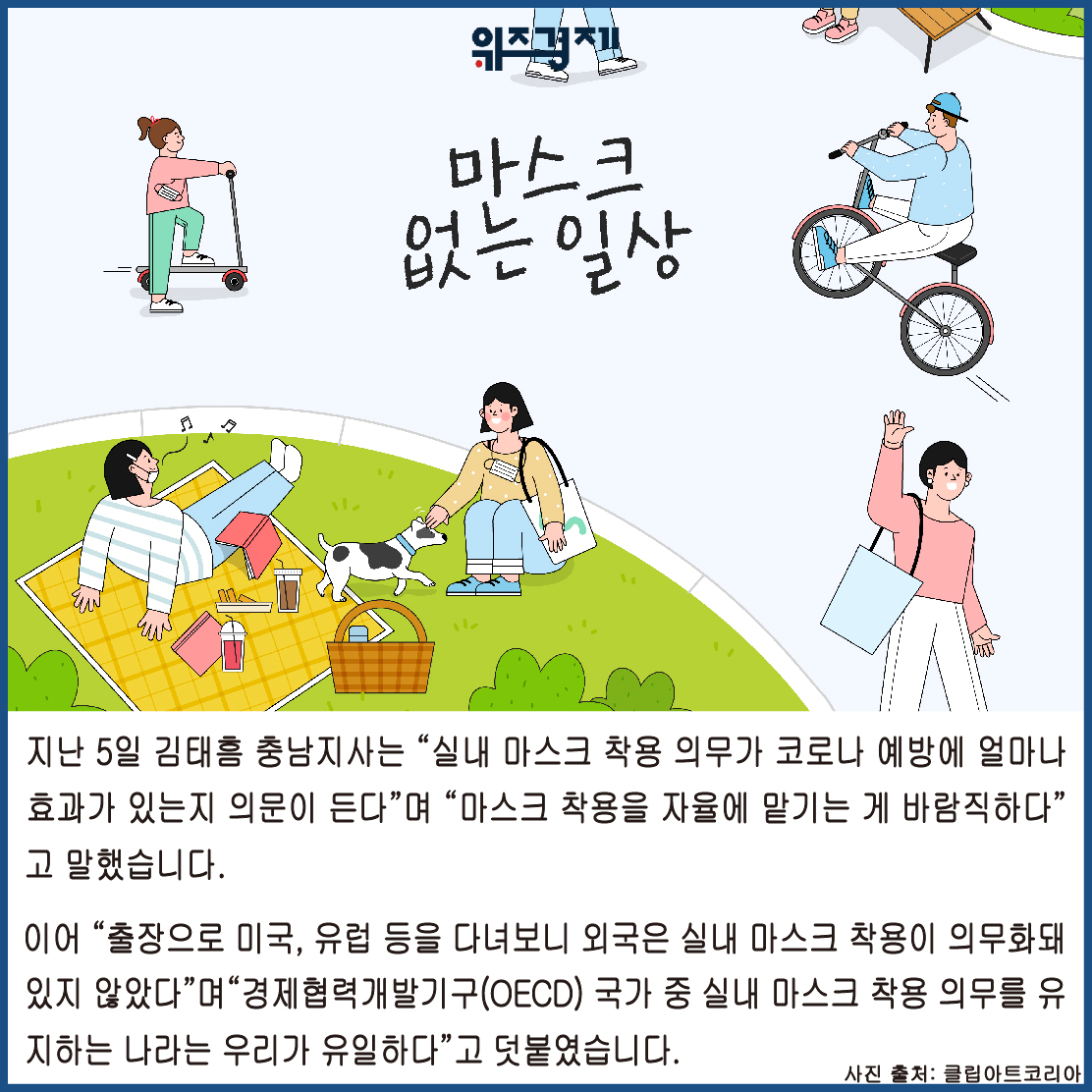 등을 다녀보니 외국은 실내 마스크 착용이 의무화돼 있지 않았다”며“경제협력개발기구(OECD) 국가 중 실내 마스크 착용 의무를 유지하는 나라는 우리가 유일하다”고