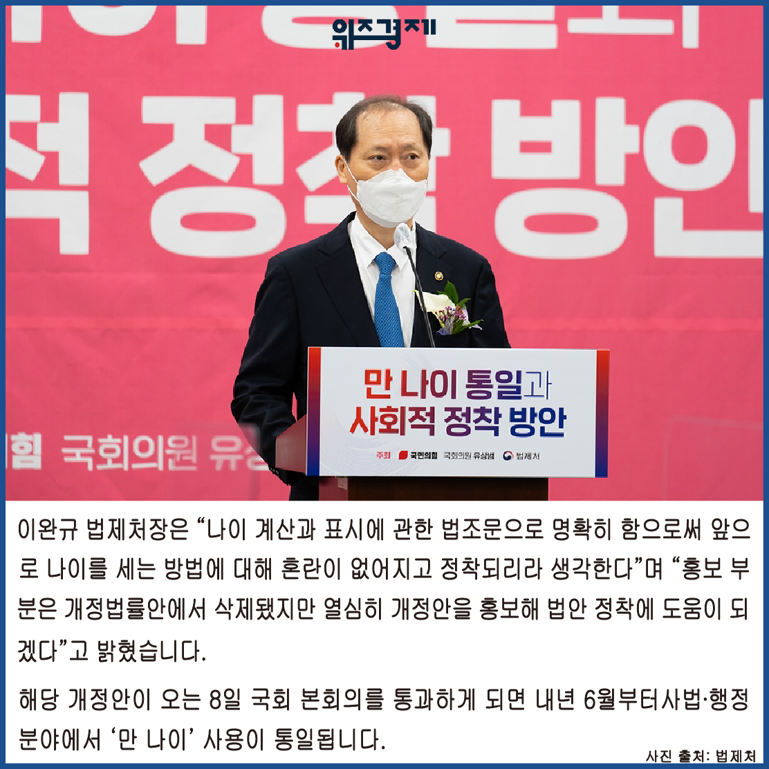 이완규 법제처장은 나이 계산과 표시에 관한 법조문으로 명확히 함으로써 앞으로 나이를 세는 방법에 대해 혼란이 없어지고 정착되리라 생각한다 홍보 부분은 개정법률안에서 삭제됐지만 열심히 개정안을 홍보해 법안 정착에 도움이 되겠다고 밝혔습니다.