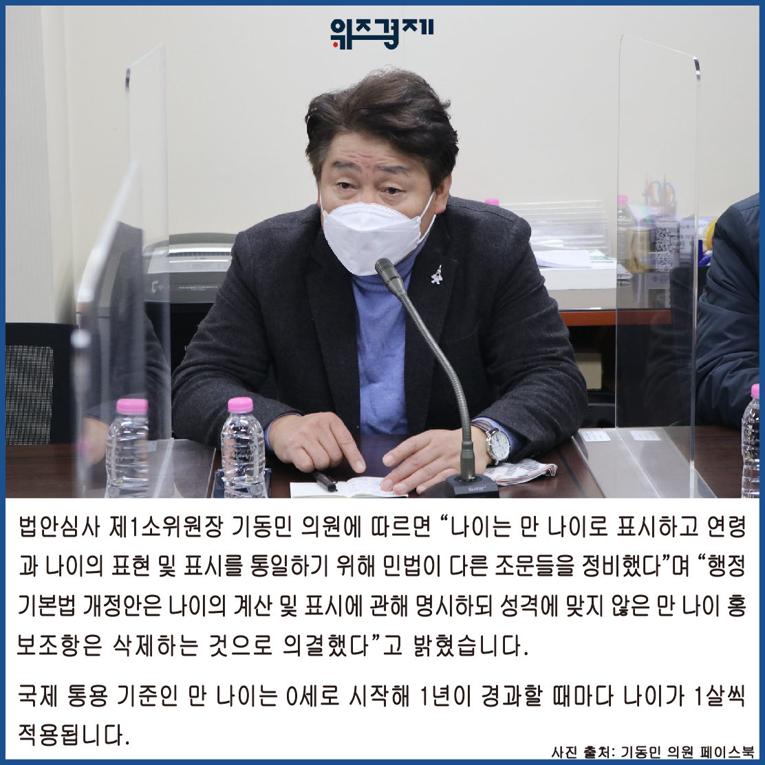 법안심사 제1소위원장 기동민 의원에 따르면 나이는 만 나이로 표시하고 연령과 나이의 표현 및 표시를 통일하기 위해 민법이 다른 조문들을 정비했다행정기본법 개정안은 나이의 계산 및 표시에 관해 명시하되 성격에 맞지 않은 만 나이 홍보조항은 삭제하는 것으로 의결했다고 밝혔습니다.