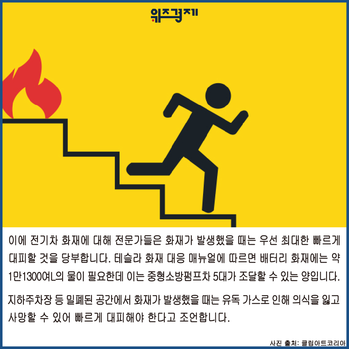이에 전기차 화재에 대해 전문가들은 화재가 발생했을 때는 우선 최대한 빠르게 대피할 것을 당부합니다. 테슬라 화재 대응 매뉴얼에 따르면 배터리 화재에는 약 1만1300여L의 물이 필요한데 이는 중형소방펌프차 5대가 조달할 수 있는 양입니다.