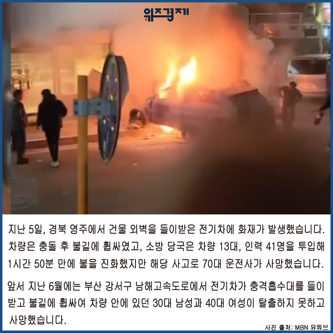 [위즈경제] 이정원 기자 = 전기차를 이용하는 사람들이 늘면서 관련 사고도 함께 늘고 있습니다.