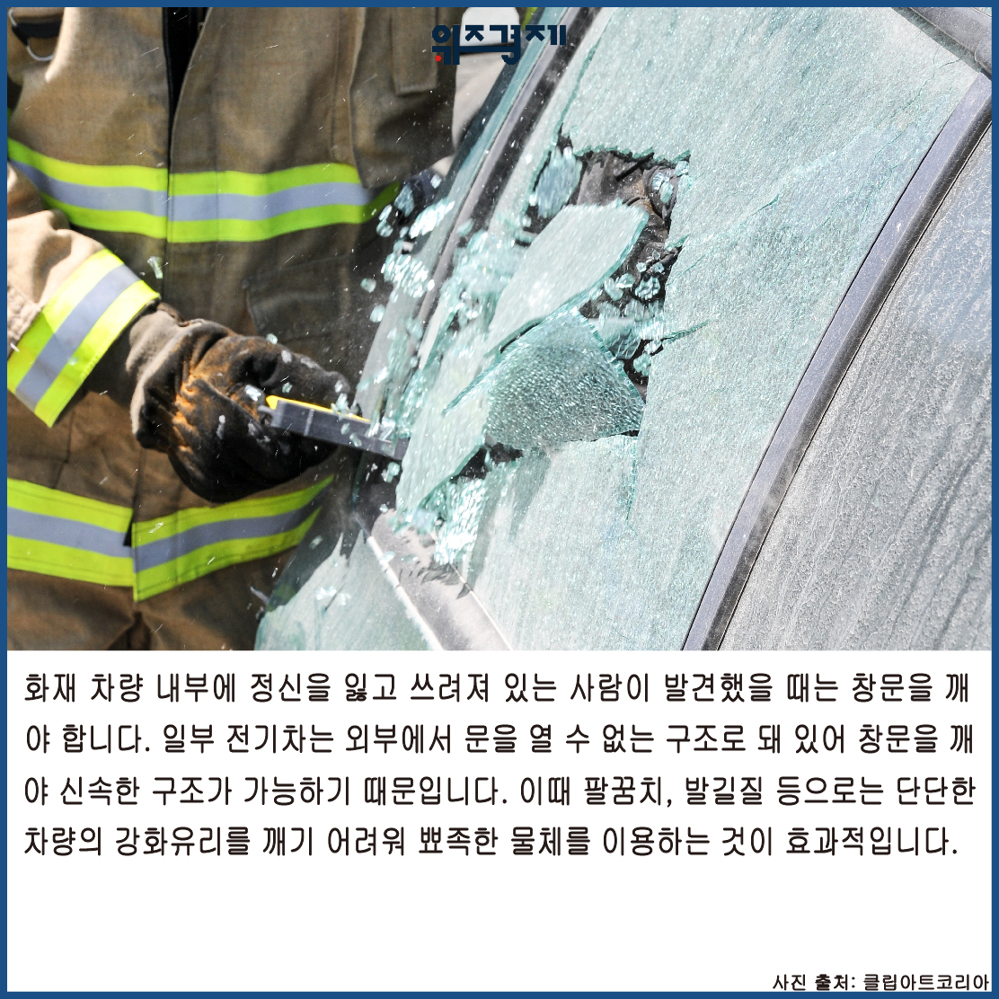 화재 차량 내부에 정신을 잃고 쓰려져 있는 사람이 발견했을 때는 창문을 깨야 한다고 합니다. 일부 전기차는 외부에서 문을 열 수 없는 구조로 돼 있어 창문을 깨야 신속한 구조가 가능하기 때문입니다. 이때 팔꿈치, 발길질 등으로는 단단한 차량의 강화유리를 깨기 어려워