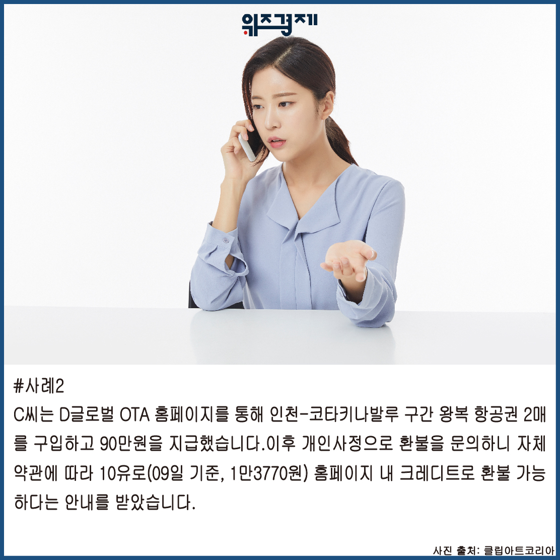 B씨는 C글로벌 OTA 홈페이지를 통해 인천-코타키나발루 구간 왕복 항공권 2매를 구입하고 90만원을 지급했습니다.이후 개인사정으로 환불을 문의하니 자체 약관에 따라 10유로(09일 기준, 1만3770원)만 홈페이지