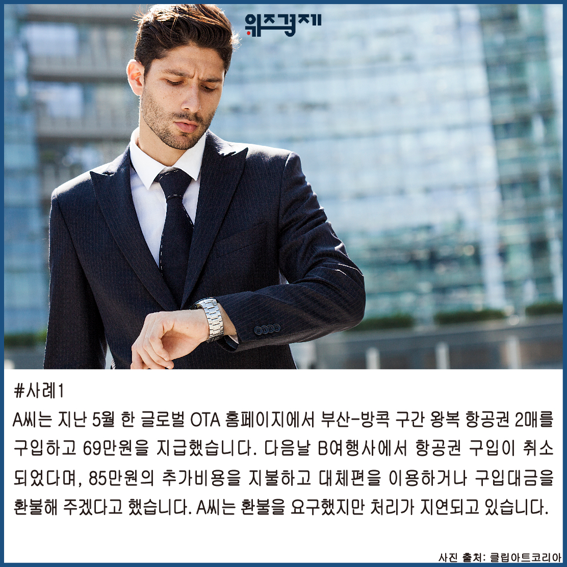 OTA 홈페이지에서 부산-방콕 구간 왕복 항공권 2매를 구입하고 69만원을 지급했습니다. 다음날 B여행사에서 항공권 구입이 취소되었다며, 85만원의 추가비용을 지불하고 대체편을 이용하거나 구입대금을 환불해 주겠다고 했습니다. A씨는 환불을 요구했지만 처리가 지연되고 있습니다.