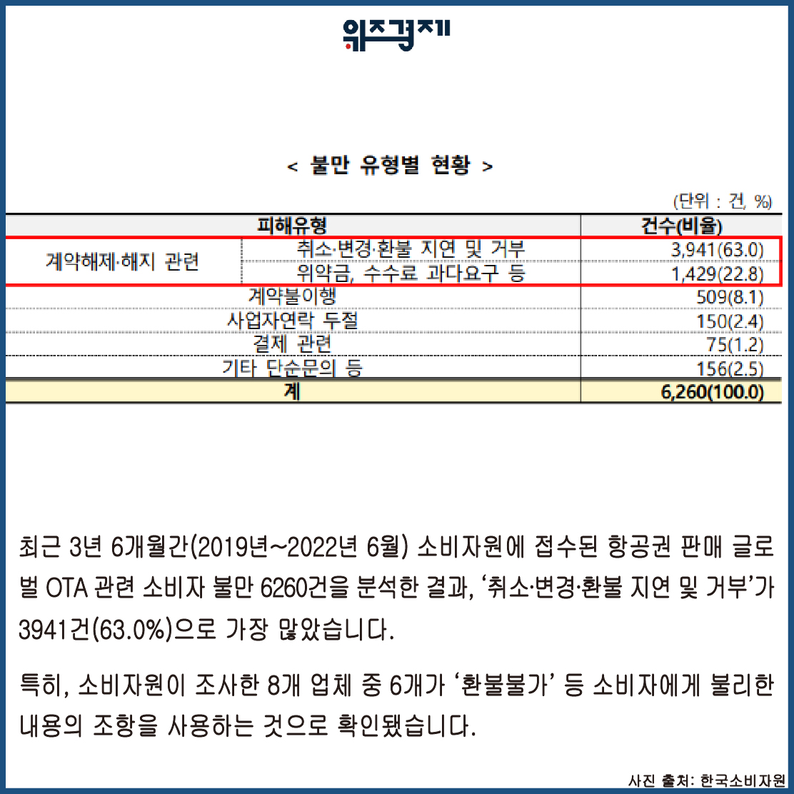 최근 3년 6개월간(2019년~2022년 6월) 소비자원에 접수된 항공권 판매 글로벌 OTA 관련 소비자 불만 6260건을 분석한 결과, ‘취소∙변경∙환불 지연 및 거부’가 3941건(63.0%)으로