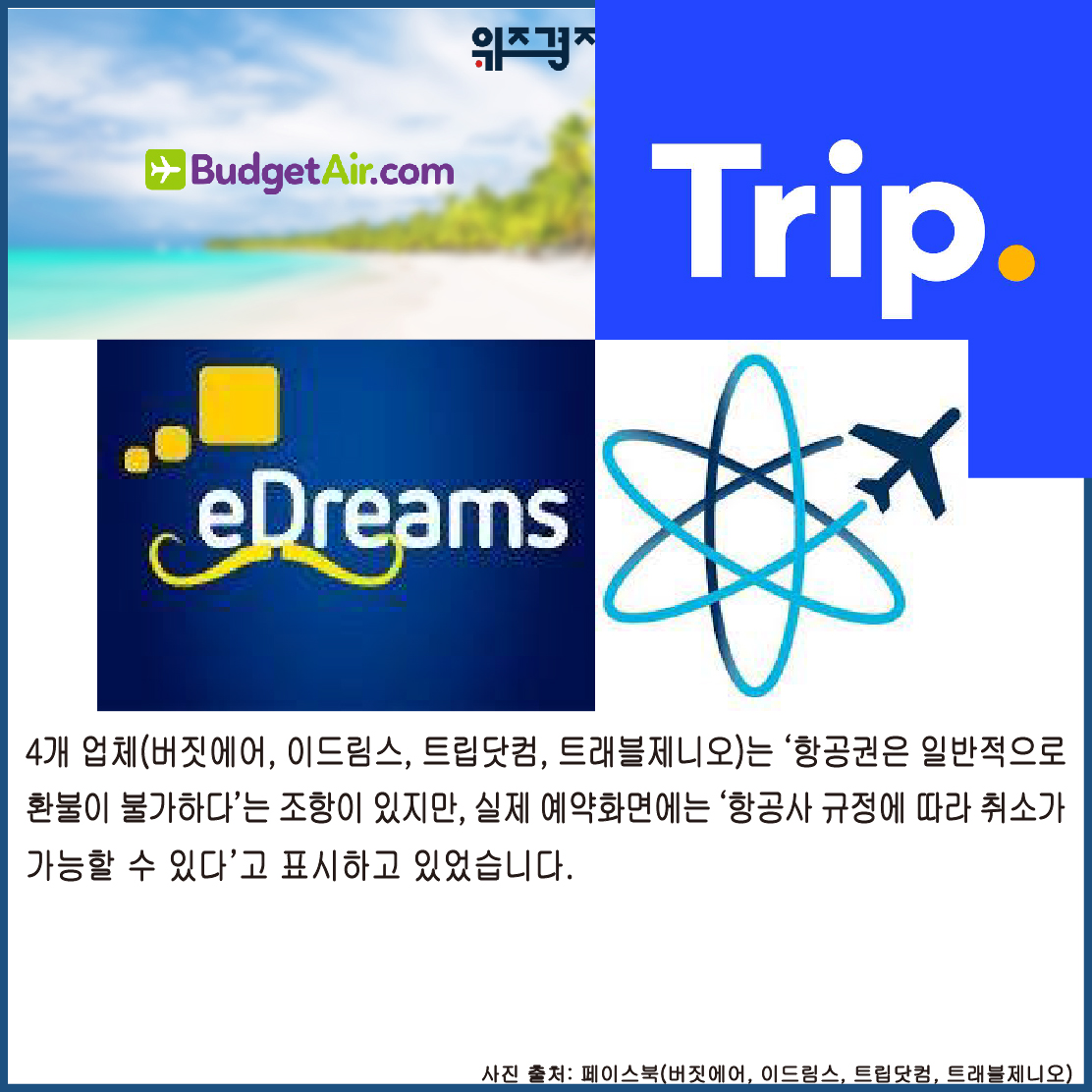 4개 업체(버짓에어, 이드림스, 트립닷컴, 트래블제니오)는 ‘항공권은 일반적으로 환불이 불가하다’는 조항이 있지만, 실제 예약화면에는 ‘항공사 규정에 따라 취소가 가능할 수 있다’고 표시하고 있었습니다.