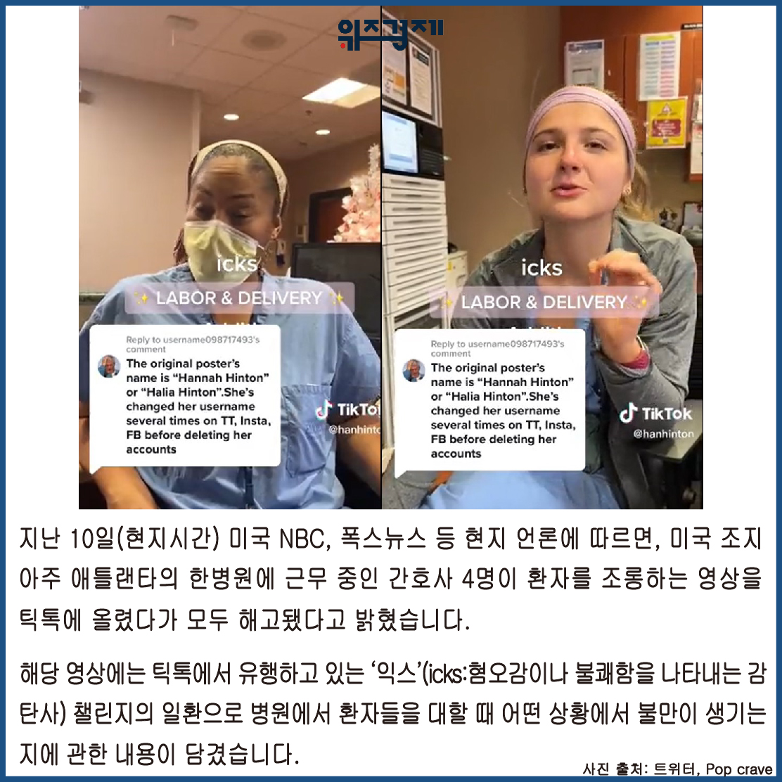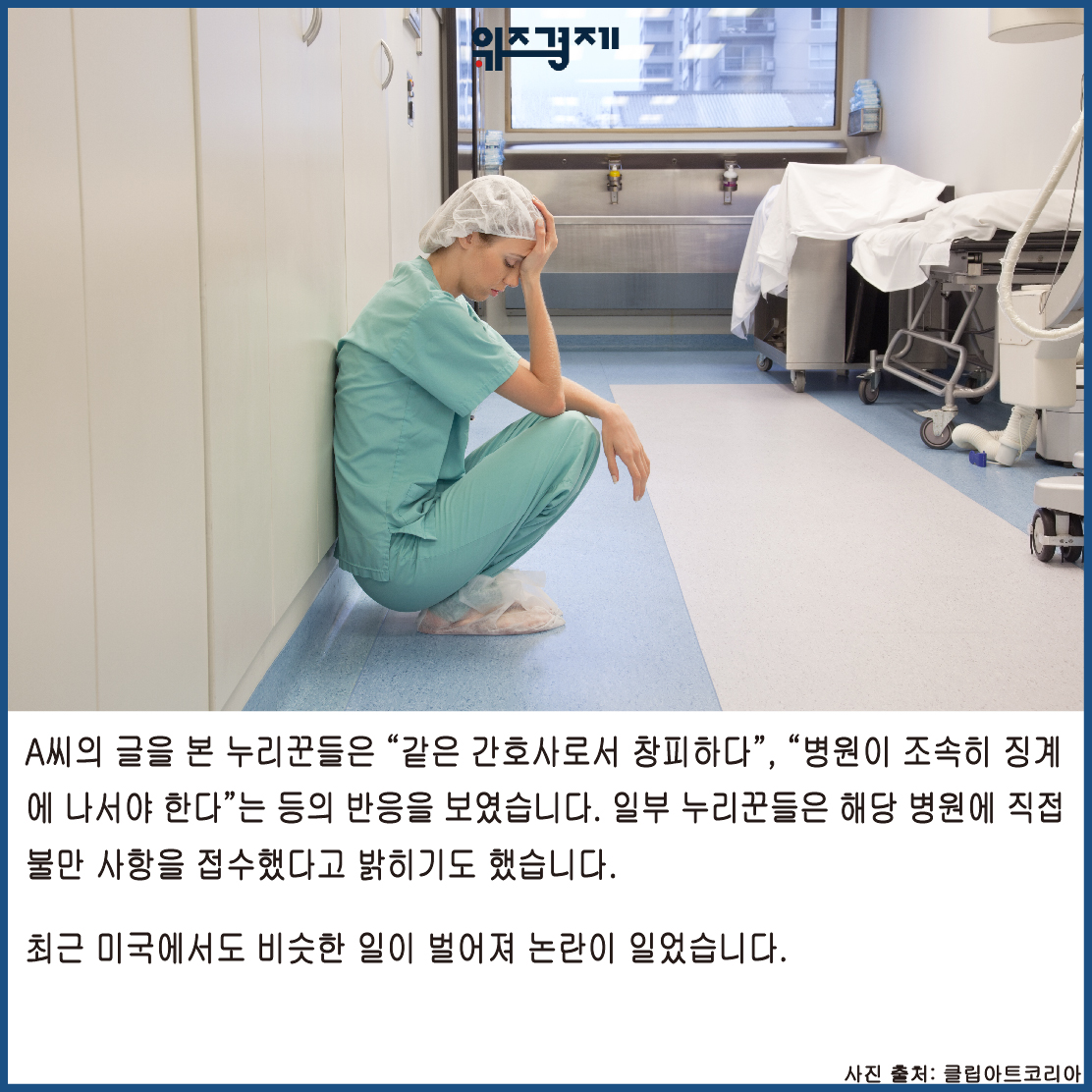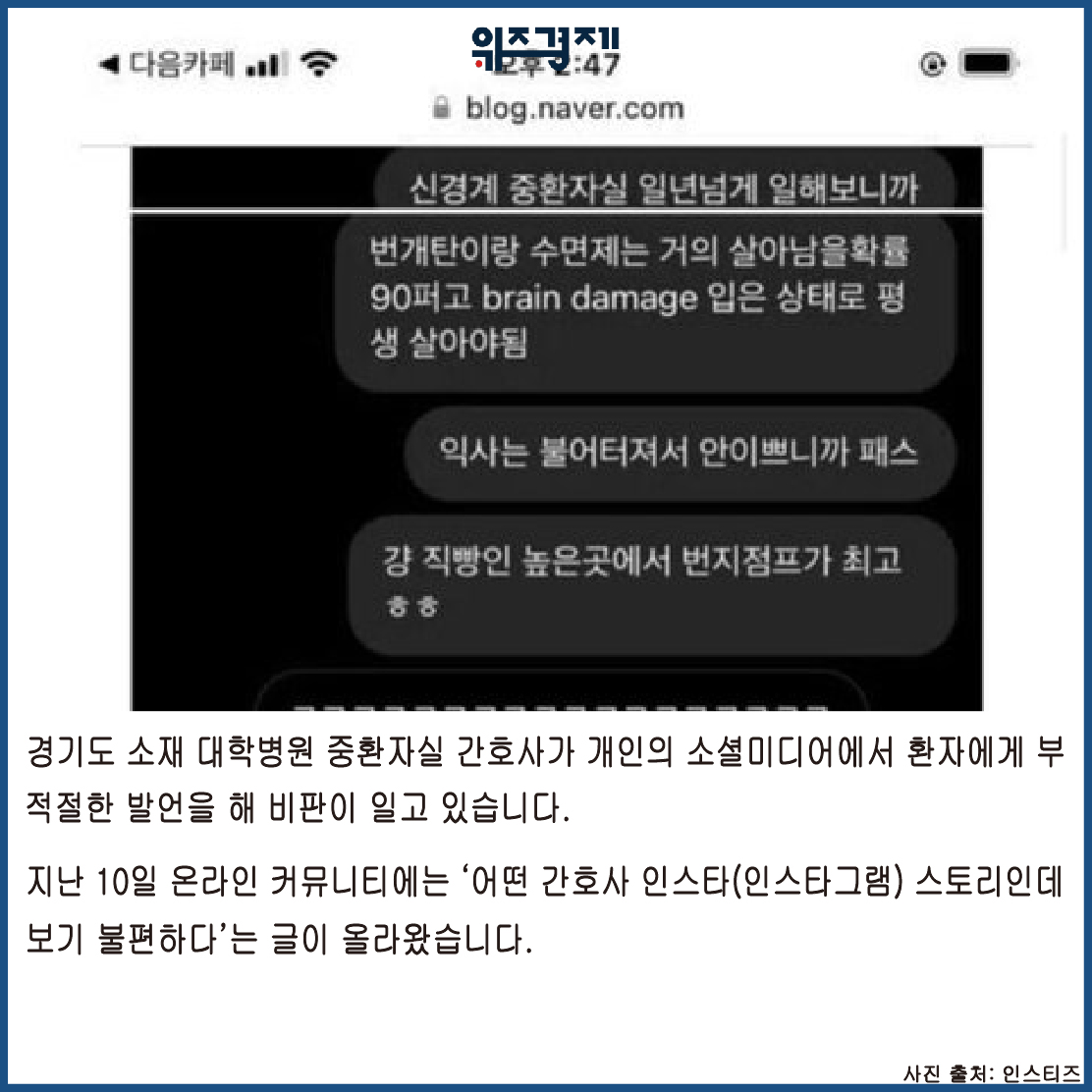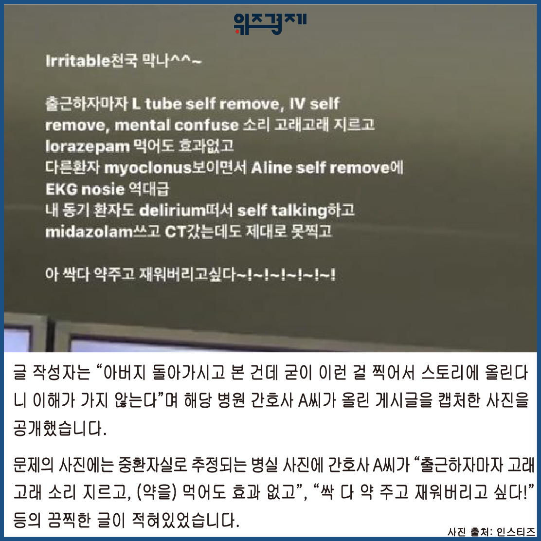 [위즈경제] 이정원 기자 = 경기도 소재 대학병원 중환자실 간호사가 개인의 소셜미디어에서 환자에게 부적절한 발언을 해 비판이 일고 있습니다.