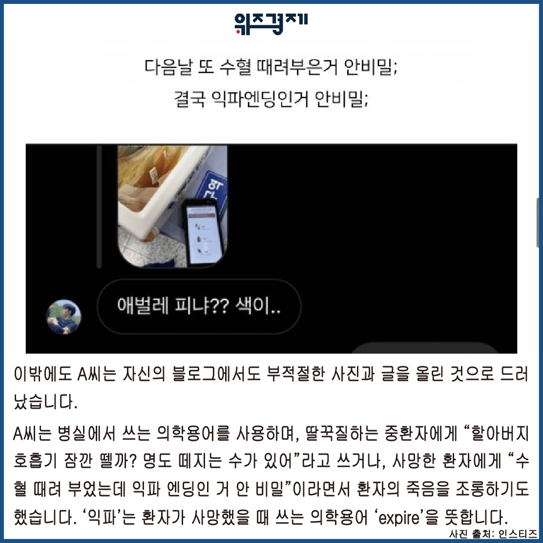 A씨는 병실에서 쓰는 의학용어를 사용하며, 딸꾹질하는 중환자에게 “할아버지 호흡기 잠깐 뗄까? 명도 떼지는 수가 있어”라고 쓰거나, 사망한 환자에게 “수혈 때려 부었는데 익파 엔딩인 거 안 비밀”이라면서 환자의 죽음을 조롱하기도 했습니다. ‘익파’는 환자가 사망했을 때 쓰는 의학용어 ‘expire’을 뜻합니다.
