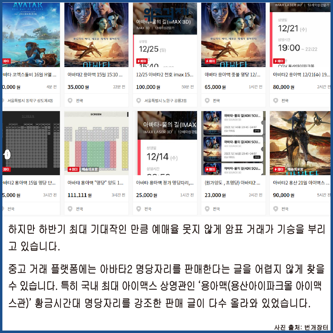 중고 거래 플랫폼에는 아바타2 명당자리를 판매한다는 글을 어렵지 않게 찾을 수 있습니다. 특히 국내 최대 아이맥스 상영관인 ‘용아맥(용산아이파크몰 아이맥스관)’ 황금시간대 명당자리를 강조한 판매 글이 다수 올라와 있습니다.
