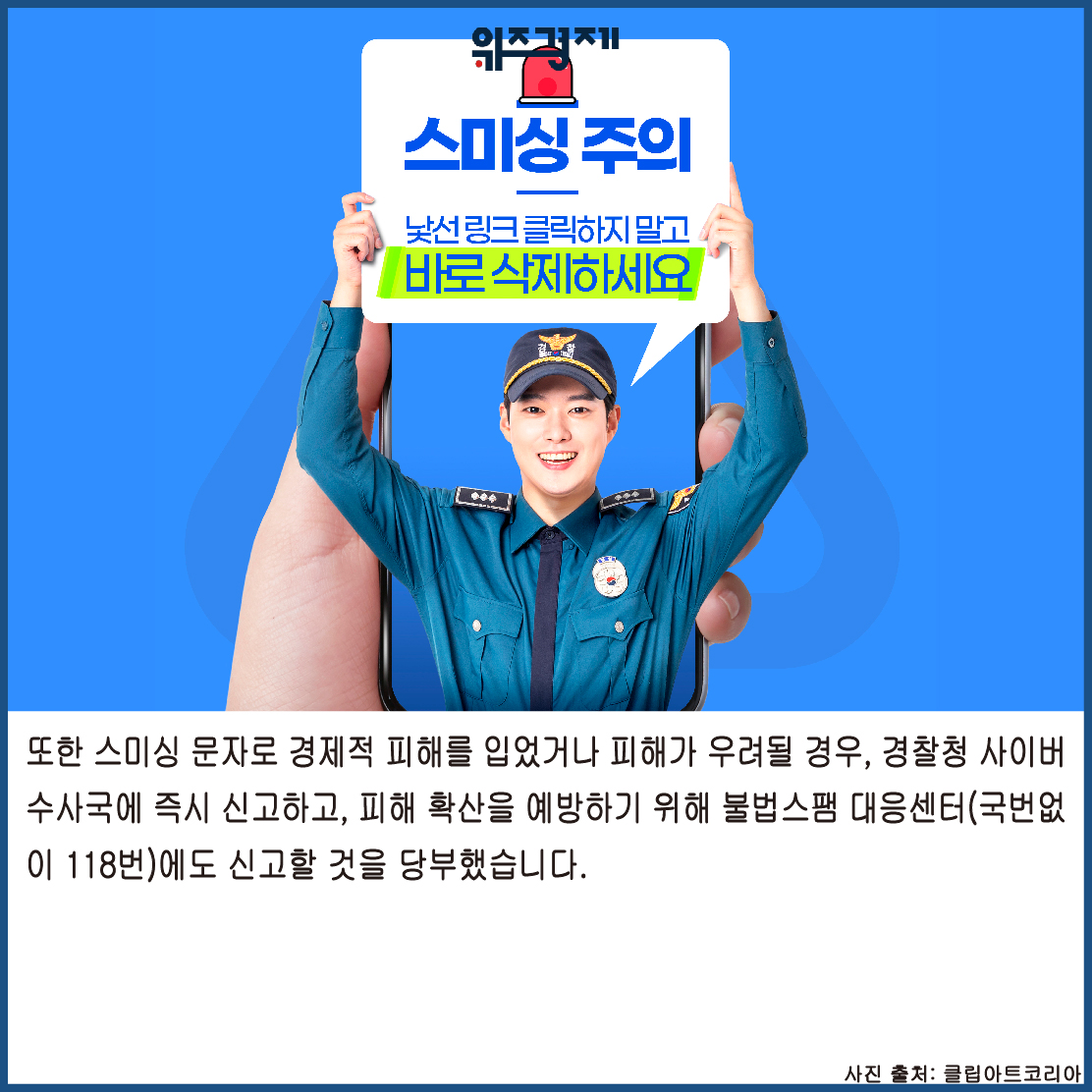 또한 스미싱 문자로 경제적 피해를 입었거나 피해가 우려될 경우, 경찰청 사이버수사국에 즉시 신고하고, 피해 확산을 예방하기 위해 불법스팸대응센터(국번없이 118)에도 신고할 것을 당부했습니다 .