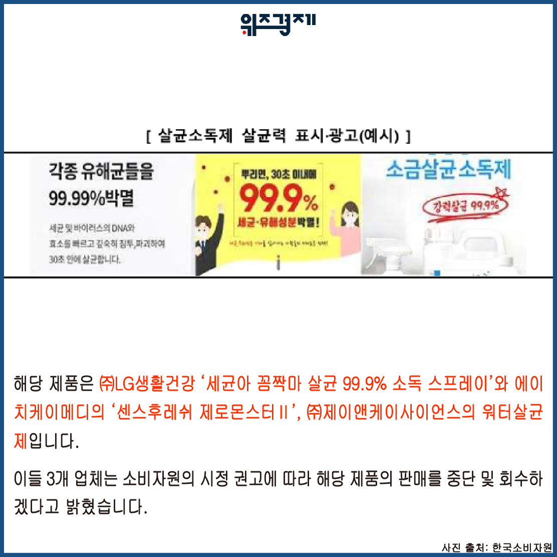 해당 제품은 LG생활건강 세균아 꼼짝마 살균 99.9% 소독 스프레이와 에이치케이메디의 센스후레쉬 제로몬스터Ⅱ’, ㈜제이앤케이사이언스의 워터살균제입니다.