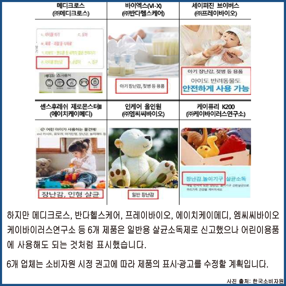 하지만 메디크로스, 반다헬스케어, 프레이바이오, 에이치케이메디, 엠씨씨바이오, 케이바이러스연구소 등 6개 제품은 일반용 살균소독제로 신고했으나 어린이용품에 사용해도 되는 것처럼 표시했습니다.