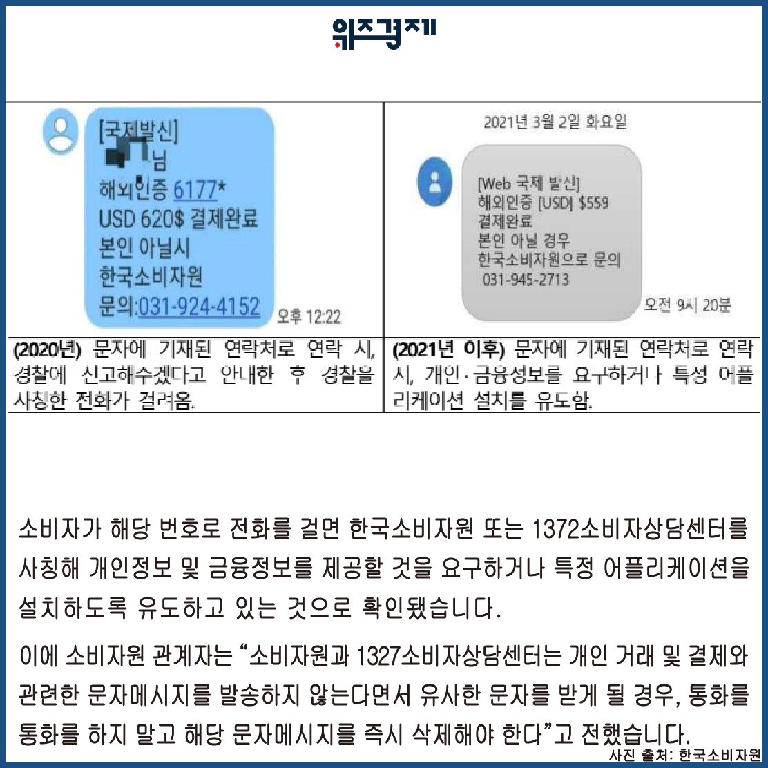 이에 소비자원 관계자는 소비자원과 1327소비자상담센터는 개인 거래 및 결제와 관련한 문자메시지를 발송하지 않는다면서 유사한 문자를 받게 될 경우, 통화를 하지 말고 해당 문자메시지를 즉시 삭제해야 한다"고 전했습니다.