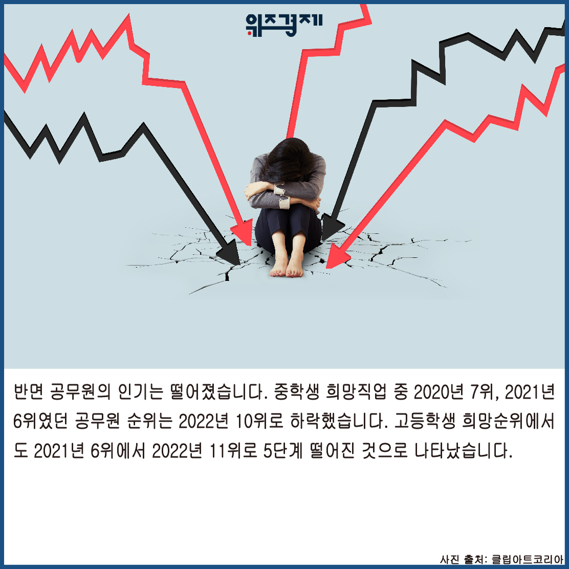 공무원 순위는 2022년 10위로 하락했습니다. 고등학생 희망순위에서도 2021년 6위에서 2022년 11위로