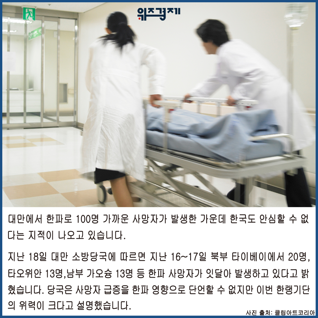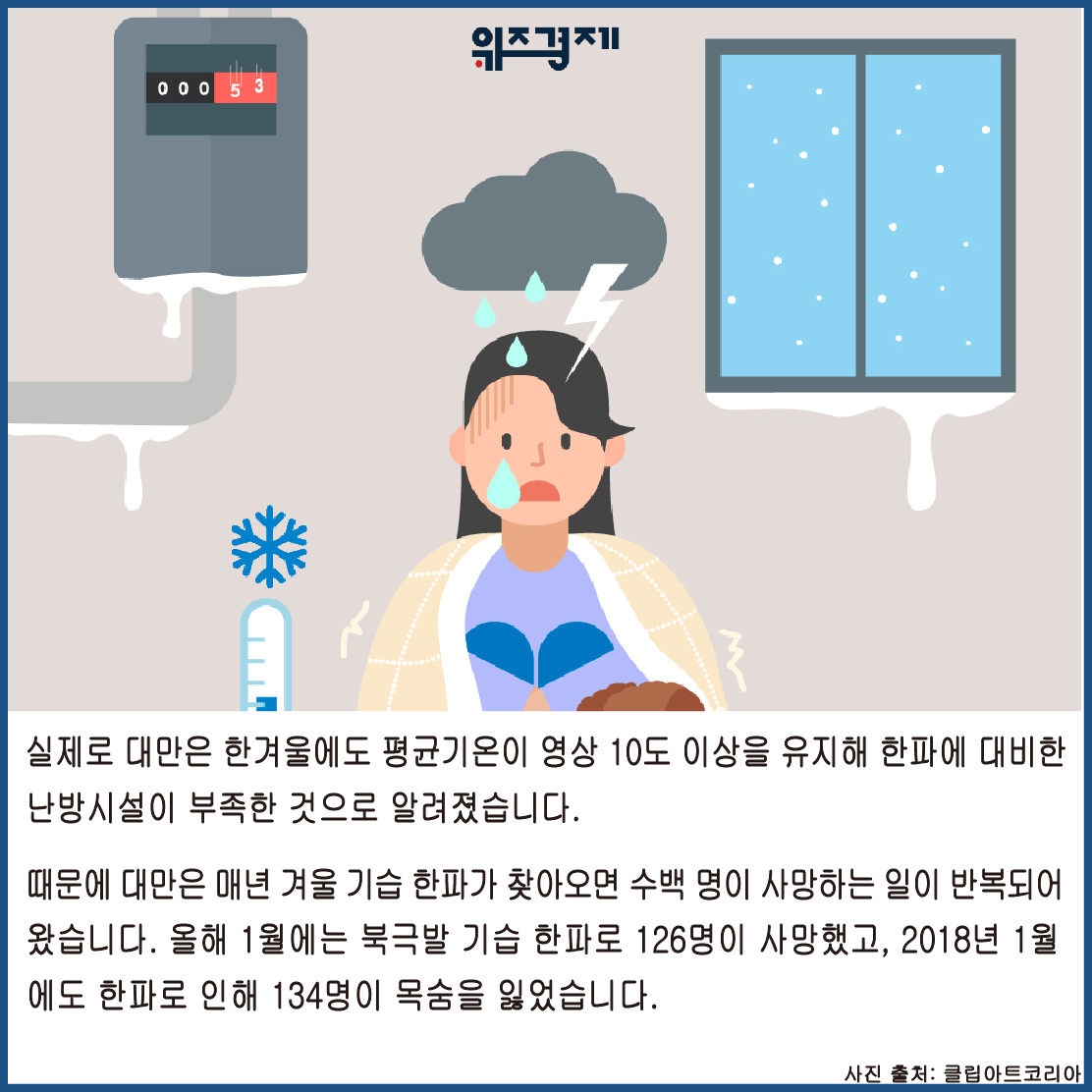[위즈경제] 이정원 기자 = 대만에서 한파로 100명 가까운 사망자가 발생한 가운데 한국도 안심할 수 없다는 지적이 나오고 있습니다.