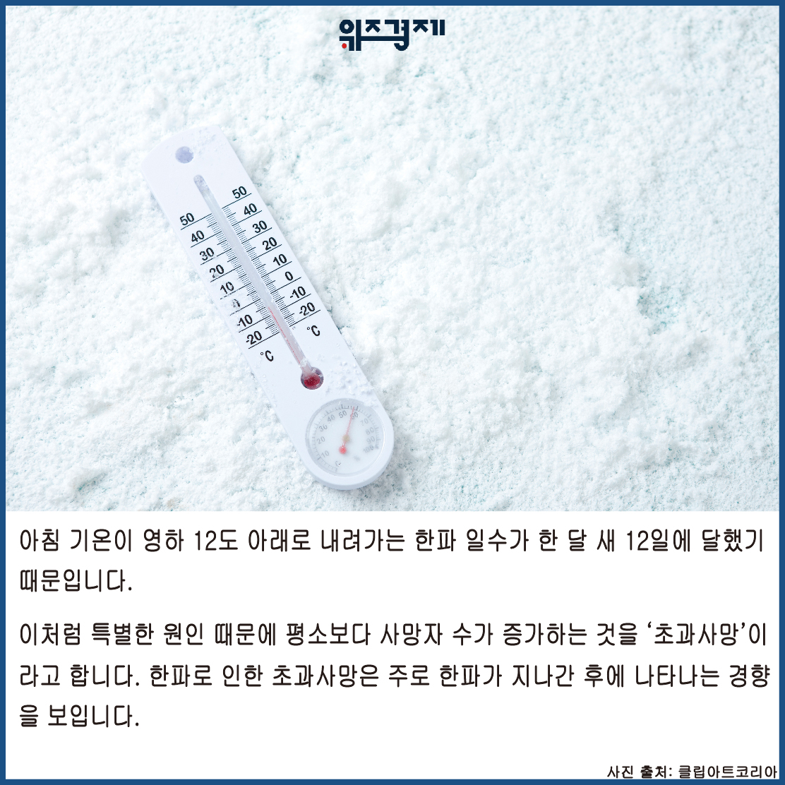 이처럼 특별한 원인 때문에 평소보다 사망자 수가 증가하는 것을 ‘초과사망’이라고 합니다. 한파로 인한 초과사망은 주로 한파가 지나간 후에 나타나는