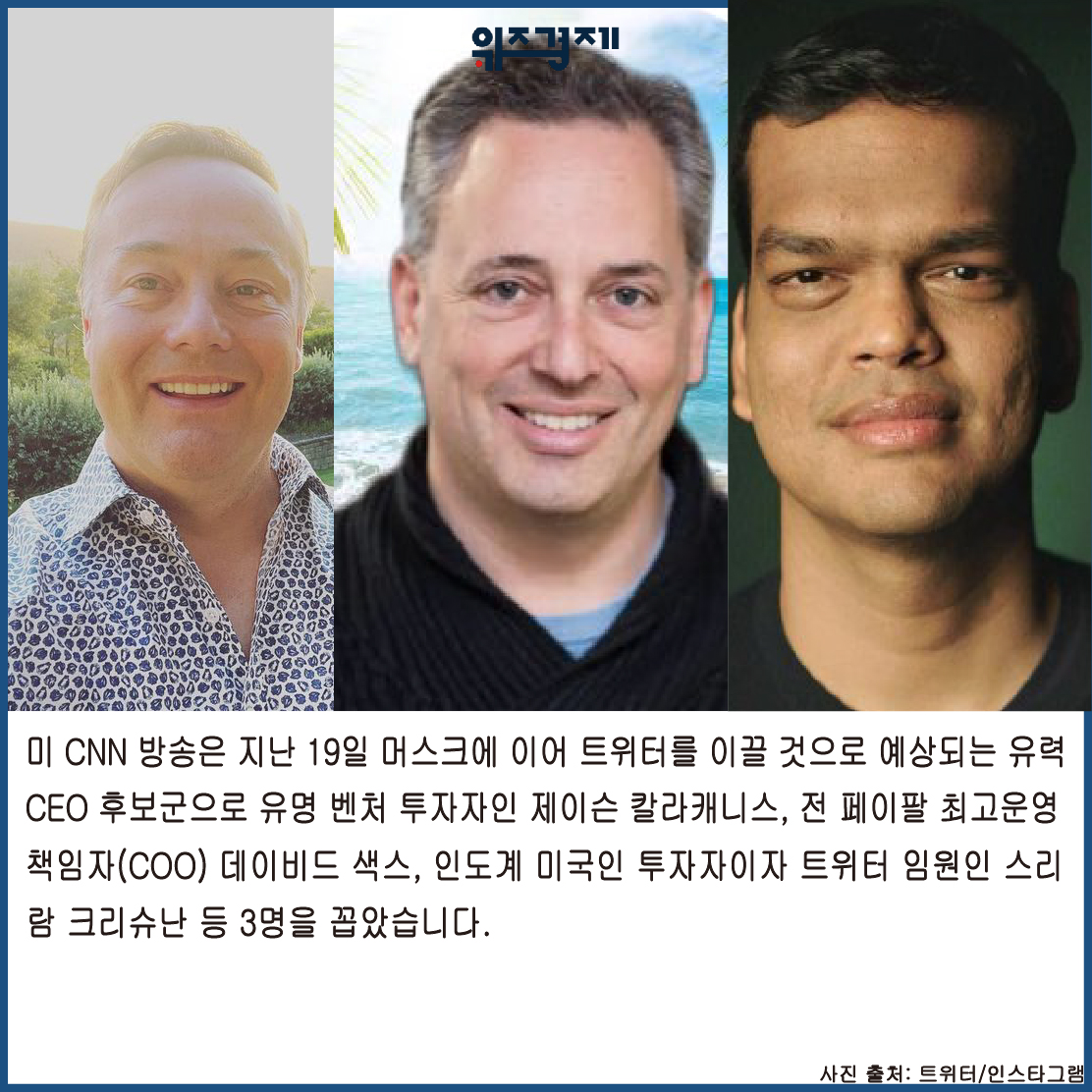 머스크에 이어 트위터를 이끌 것으로 예상되는 유력 CEO후보군으로 유명 벤처 투자자인 제이슨 칼라캐니스, 전 페이팔 최고운영책임자(COO) 데이비드 색스, 인도계 미국인 투자자이자 트위터 임원인 스리람 크리슈난 등 3명을