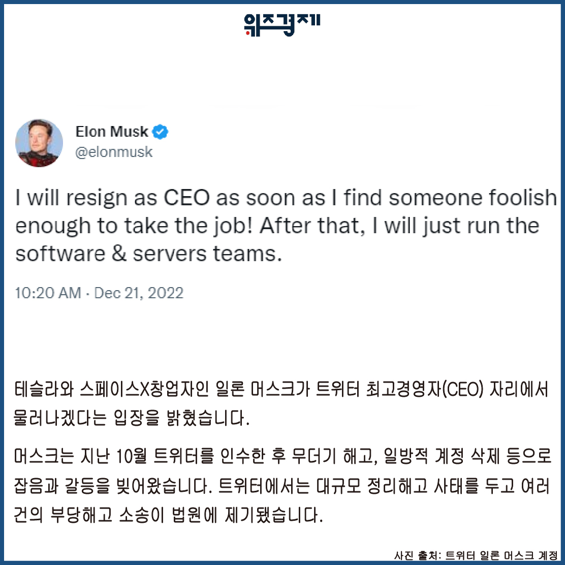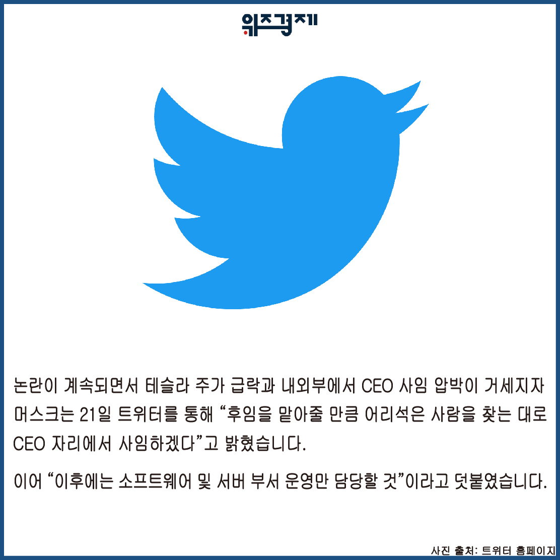 [위즈경제] 이정원 기자 =테슬라와 스페이스X창업자인 일론 머스크가 트위터 최고경영자(CEO) 자리에서 물러나겠다는 입장을 밝혔습니다.