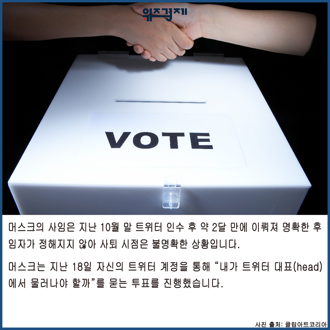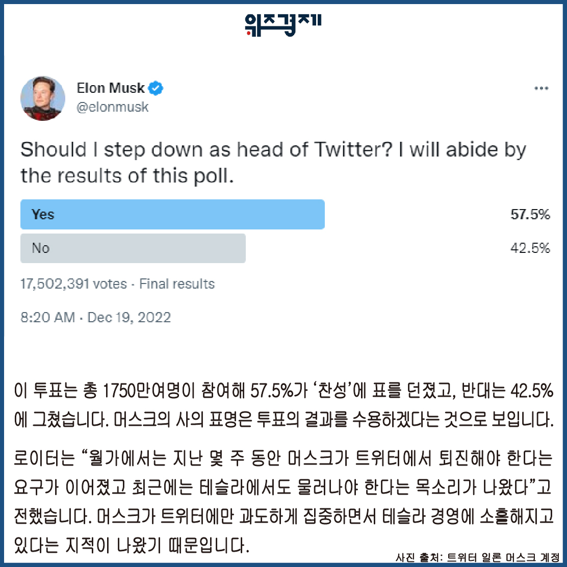 머스크는 지난 18일 자신의 트위터 계정을 통해 “내가 트위터 대표(head)에서 물러나야 할까”를 묻는 투표를 진행했습니다.
