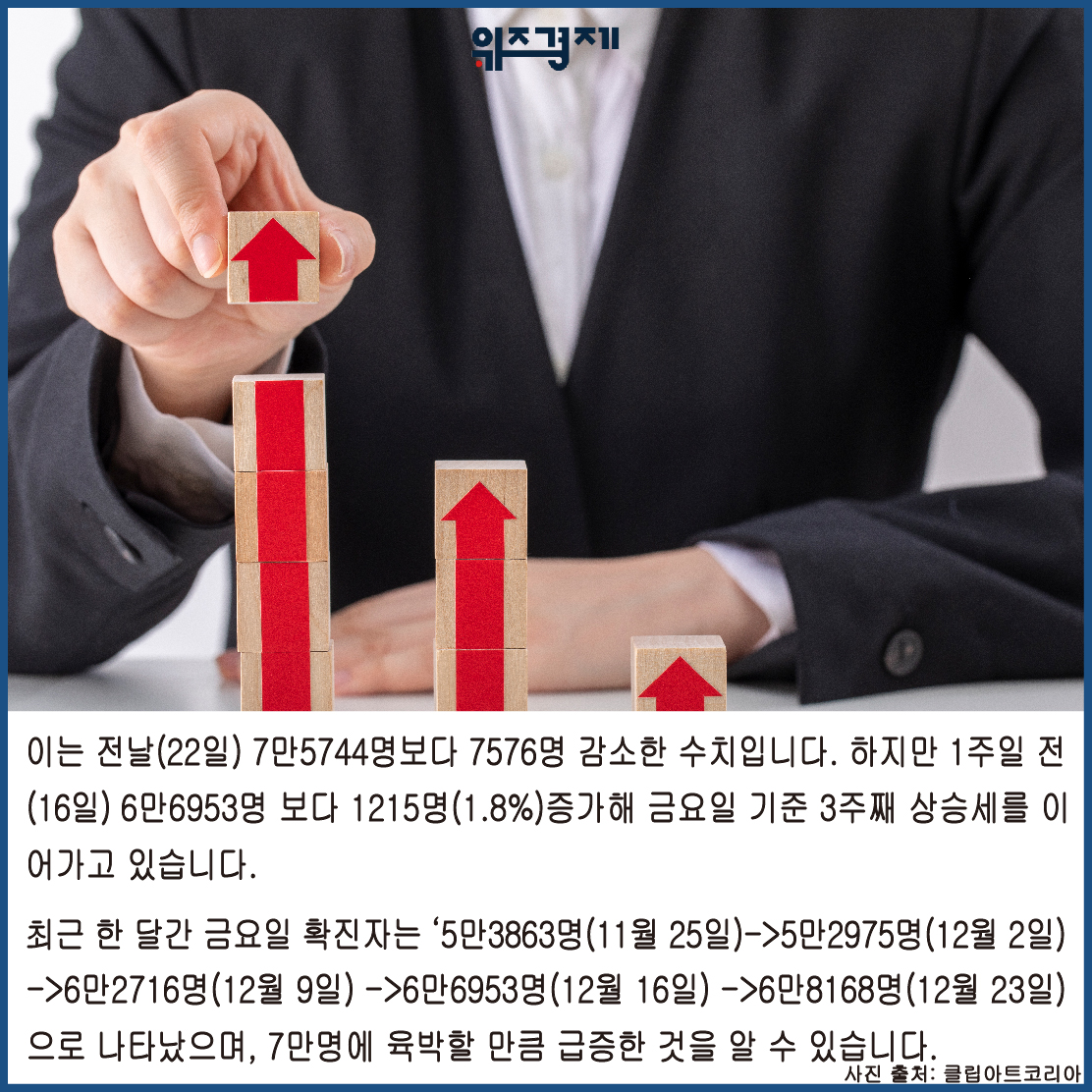 최근 한 달간 금요일 확진자는 ‘5만3863명(11월 25일)->5만2975명(12월 2일) ->6만2716명(12월 9일) ->6만6953명(12월 16일) ->6만8168명(12월 23일)’으로 나타났으며, 7만명에 육박할 만큼 급증한 것을 알 수 있습니다.