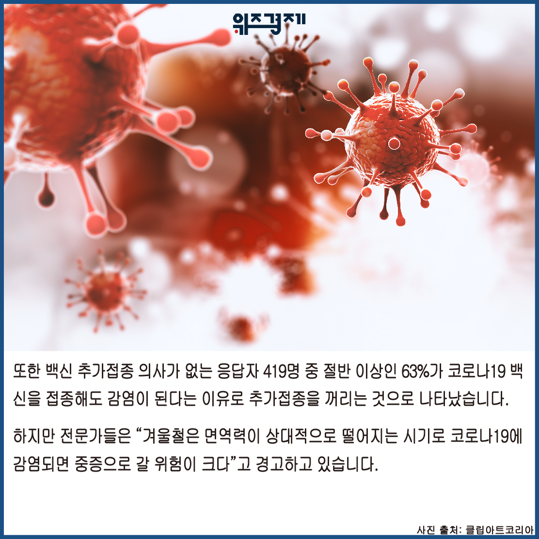 또한 백신 추가접종 의사가 없는 응답자 419명 중 절반 이상인 63%가 코로나19 백신을 접종해도 감염이 된다는 이유로 추가접종을