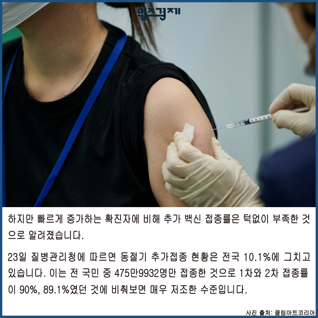 23일 질병관리청에 따르면 동절기 추가접종 현황은 전국 10.1%에 그치고 있습니다. 이는 전 국민 중 475만9932명만 접종한 것으로 1차와