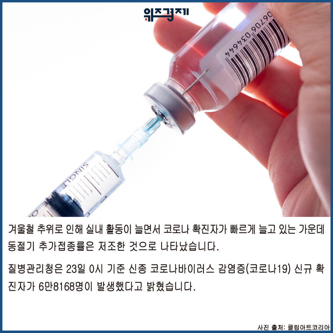 [위즈경제] 이정원 기자 =겨울철 추위로 인해 실내 활동이 늘면서 코로나 확진자가 빠르게 늘고 있는 가운데 동절기 추가접종률은 저조한 것으로 나타났습니다.