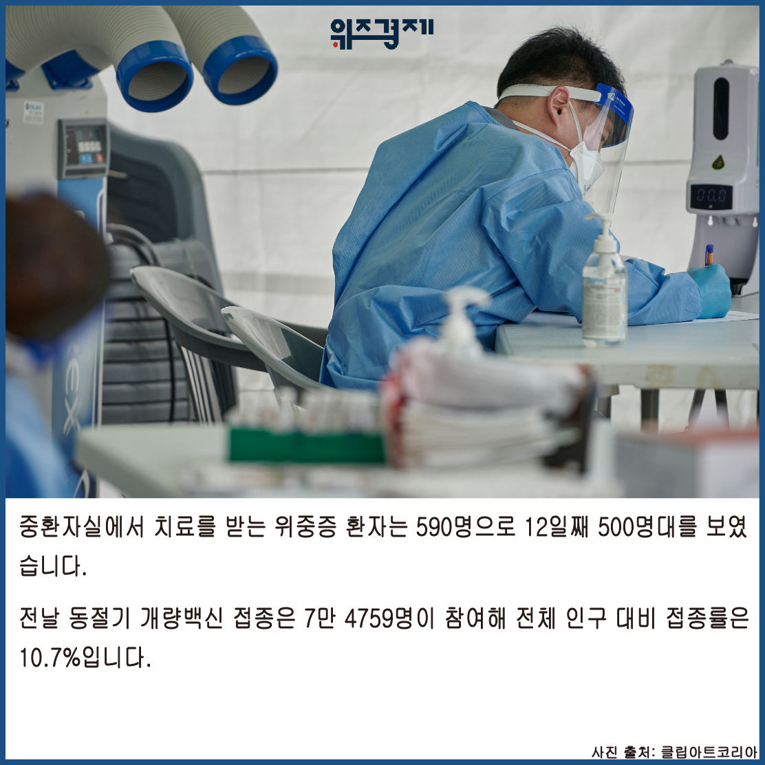 중환자실에서 치료를 받는 위중증 환자는 590명으로 12일째 500명대를 보였습니다.