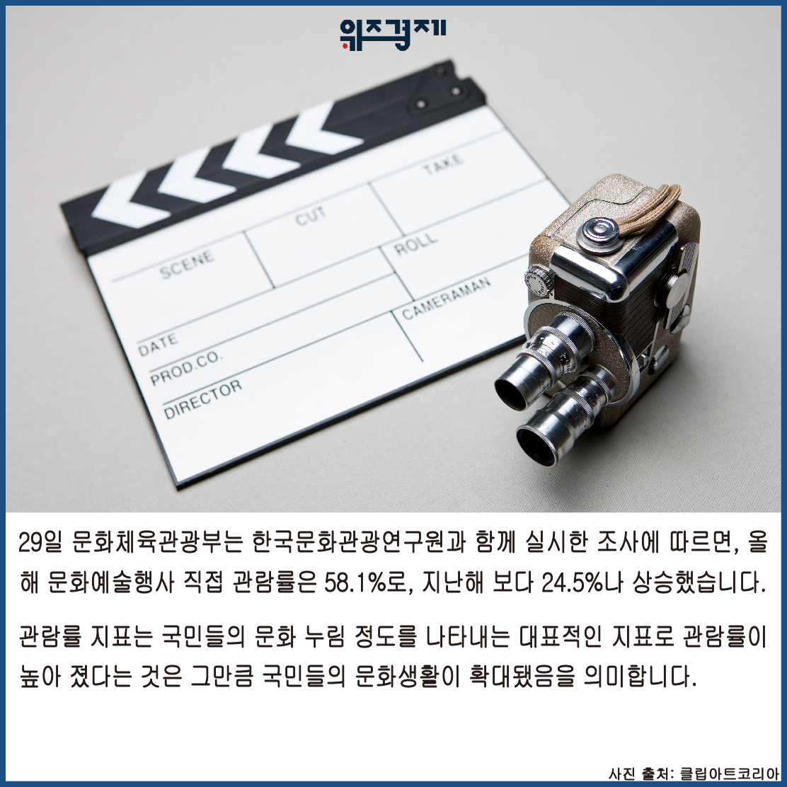 29일 문화체육관광부는 한국문화관광연구원과 함께 실시한 조사에 따르면, 올해 문화예술행사 직접 관람률은 58.1%로, 지난해 보다 24.5%나 상승했습니다.