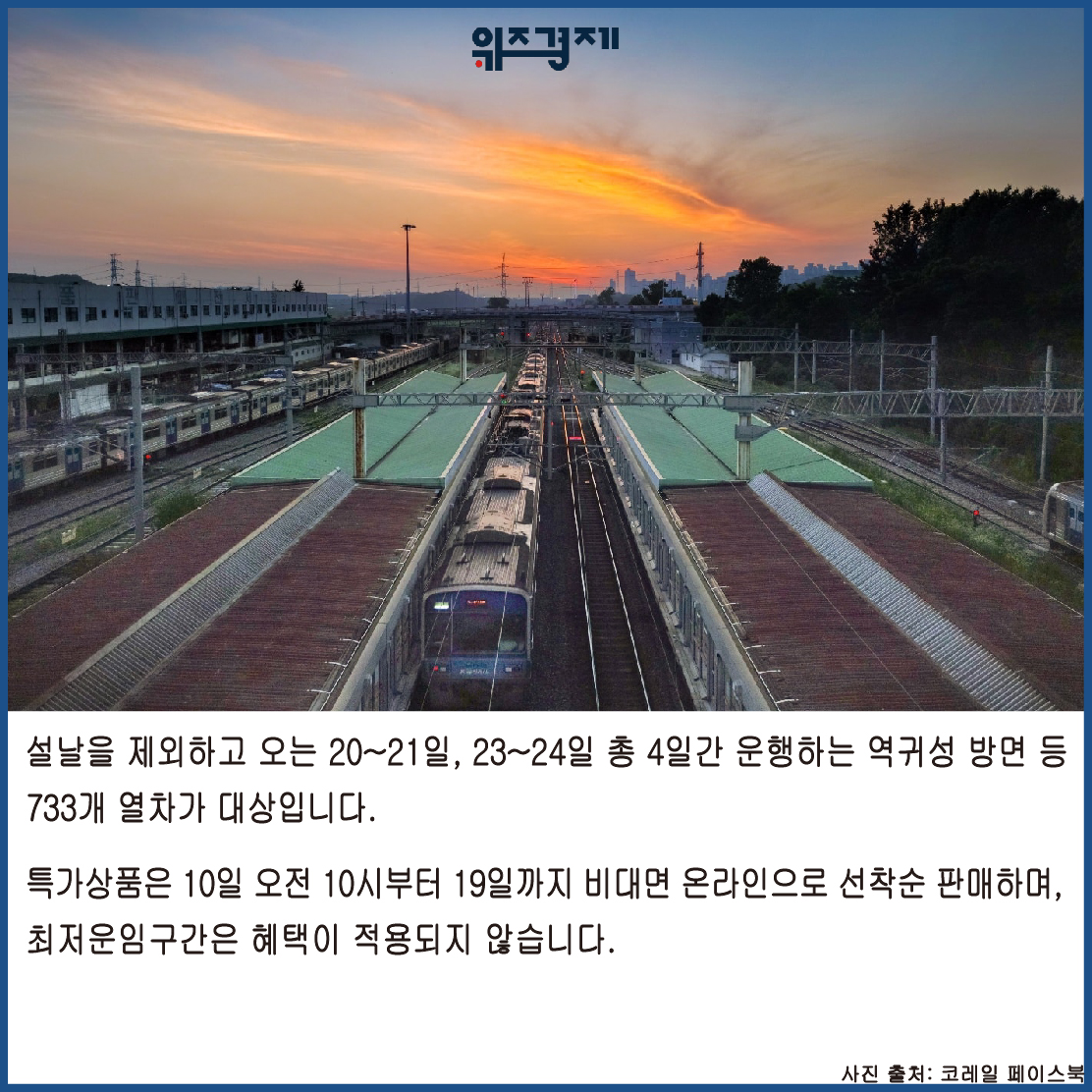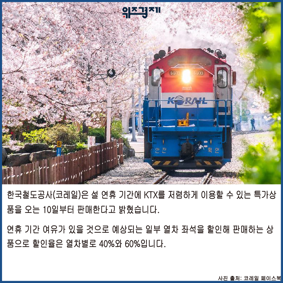 [위즈경제] 이정원 기자 =한국철도공사(코레일)은 설 연휴 기간에 KTX를 저렴하게 이용할 수 있는 특가상품을 오는 10일부터 판매한다고 밝혔습니다.