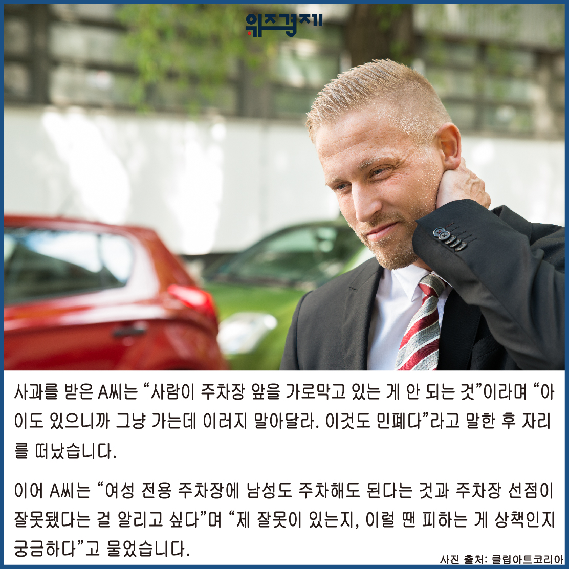 주차장에 남성도 주차해도 된다는 것과 주차장 선점이 잘못됐다는 걸 알리고 싶다”며 “제 잘못이 있는지, 이럴 땐 피하는 게 상책인지 궁금하다”고 물었습니다.